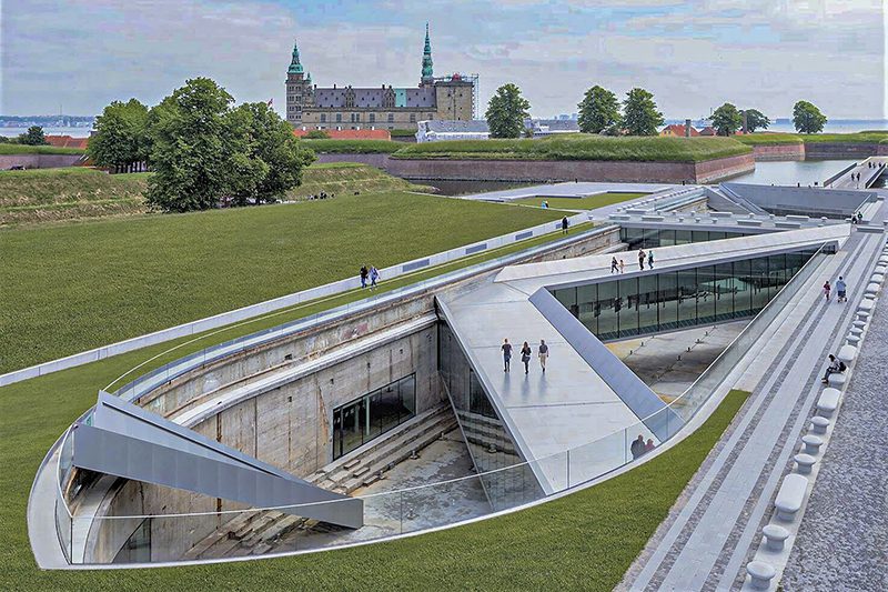 È probabile che di fronte alla sfida di costruire un museo al posto di un bacino di carenaggio dismesso – un’enorme trincea scavata nel terreno – la maggior parte degli architetti ne colmerebbe il volume con un edificio di diversi piani. A Helsingør, tuttavia, una simile struttura farebbe a pugni con le imponenti forme rinascimentali del vicinissimo Kronborg slot, che fa parte del patrimonio dell’Unesco. Così, per il Maritime Museum of Denmark, si è optato per una soluzione originale e si è lasciato intatto il volume del bacino, che viene attraversato da una passerella vitrea che lo sorvola a zig-zag.