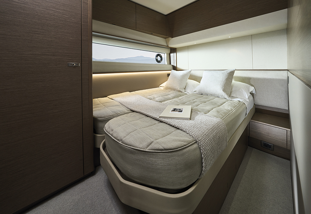 Sul ponte inferiore si trovano tre cabine, tra cui una spaziosa VIP a prua, una doppia a dritta (convertibile in una terza matrimoniale) e un’armatoriale a tutto baglio con zona colazione, bagno in stile “superyacht” e cabina armadio. È disponibile anche un’opzionale cabina equipaggio a poppa.