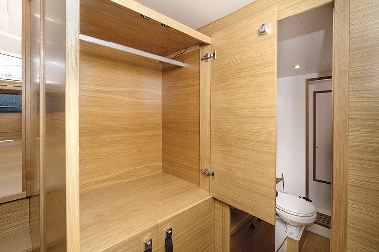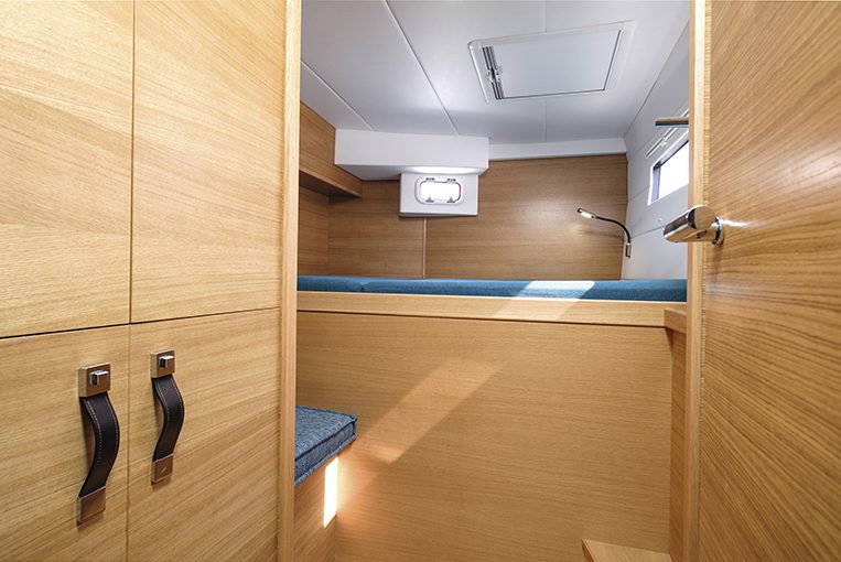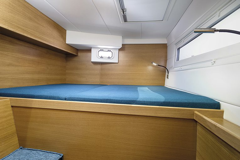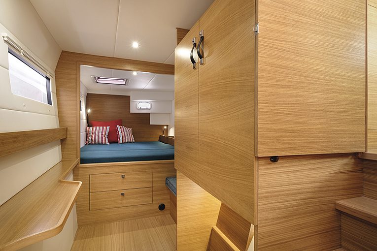Cabine ospiti: nello scafo di sinistra, matrimoniale di poppa per baglio; cabina di prua con possibilità di una cuccetta ribaltabile, leggermente sacrificata.