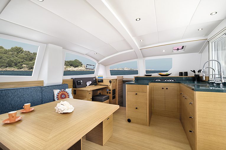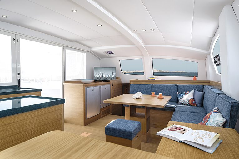 La suddivisione degli interni prevede in ogni caso un quadrato ampio e funzionale che ingloba timoneria interna e cucina, mentre sottocoperta lo scafo di dritta è interamente dedicato agli spazi armatoriali, quello di sinistra ospita due cabine doppie per gli ospiti.