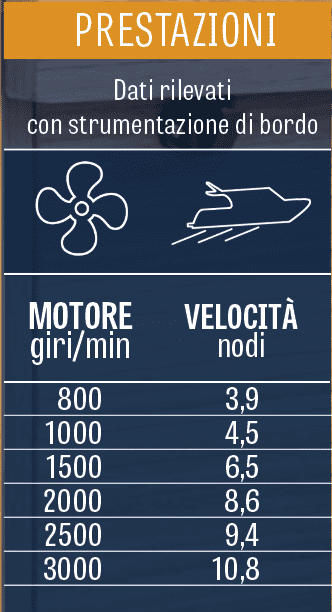 Navigazione a motore: prestazioni soddisfacenti ma, nell’occasione, elica poco performante (modifica prevista).
