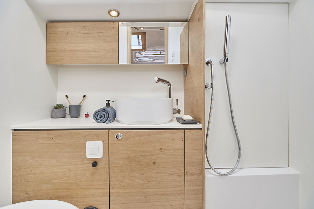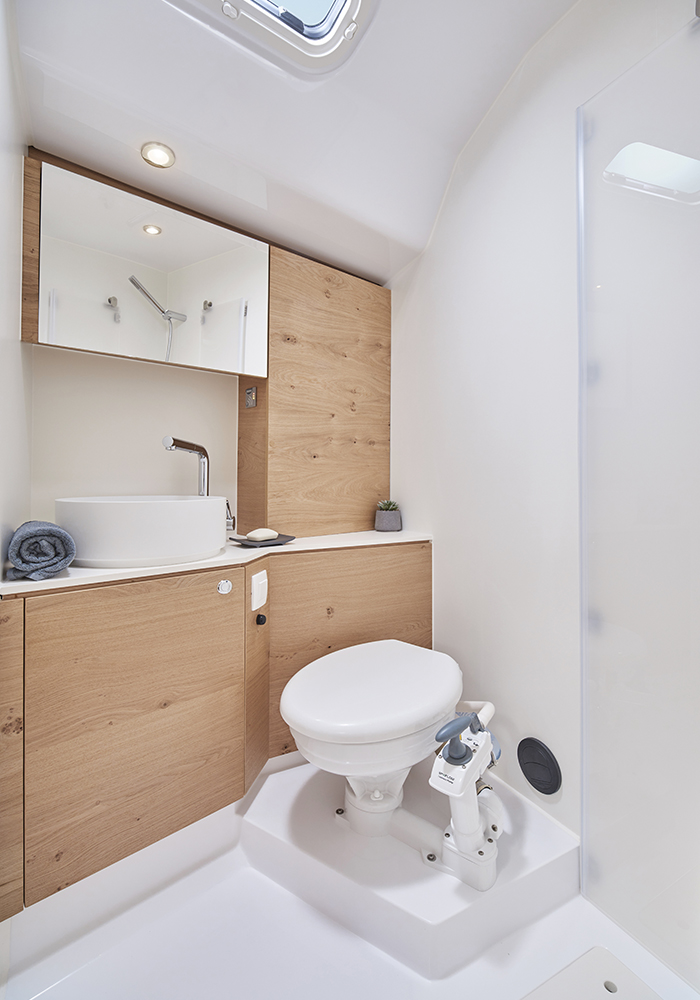 Possiamo testimoniare che la versione a tre cabine di questa prova, con una bella armatoriale a prua, due comode matrimoniali a poppa e, nel mezzo, un quadrato che non si esita a chiamare salone, risulta senz’altro ideale per una famiglia; potendo valutarla solo sul pianetto, quella a quattro cabine è senz’altro più appetibile se si pensa al charter ma, a dir la verità, sembra non perdere molto in comodità complessiva.
