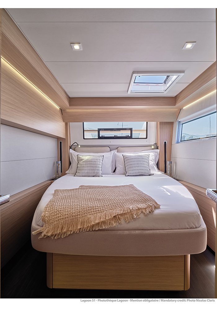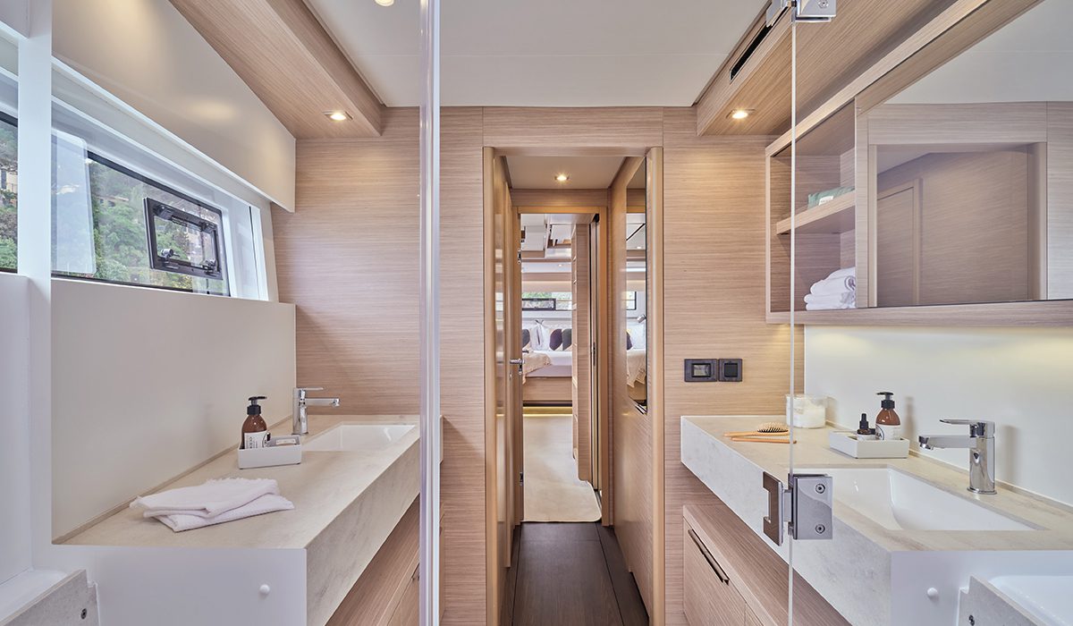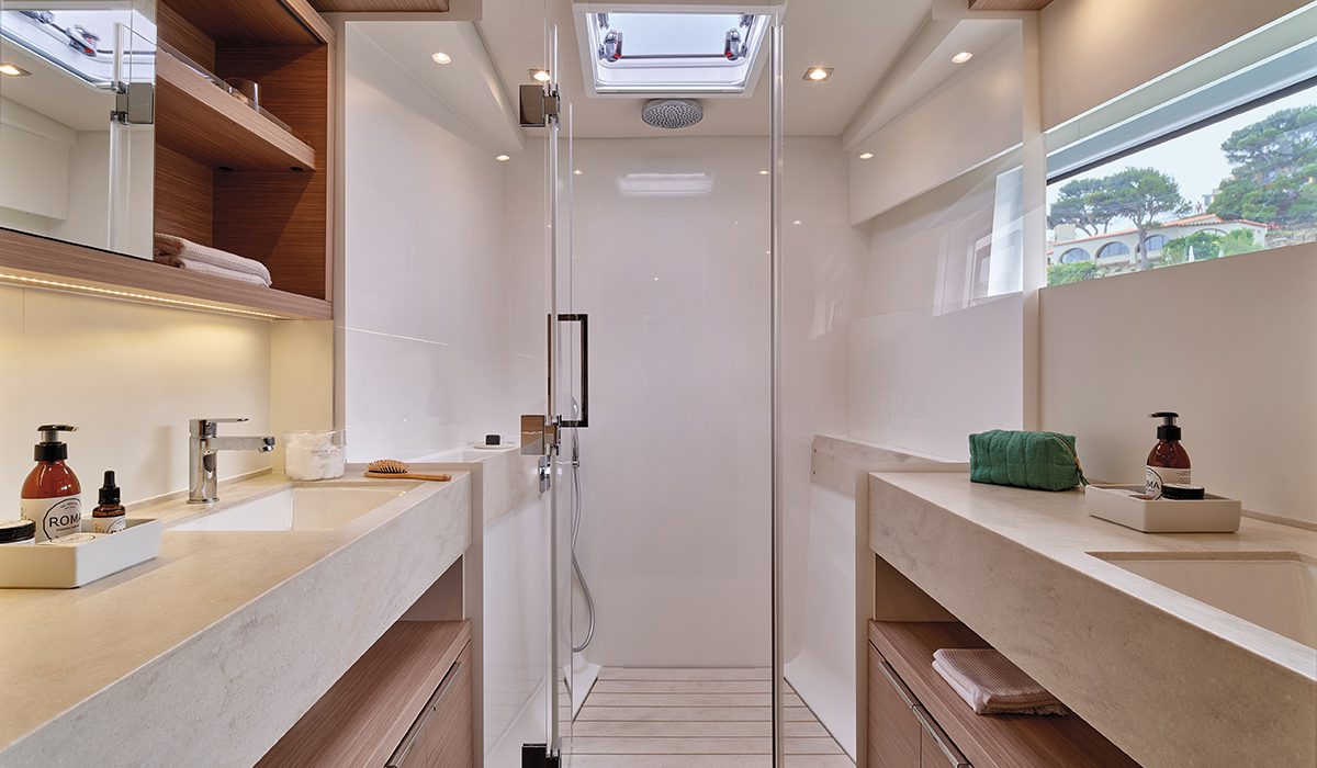 Negli interni è certamente il salone a catturare l’attenzione, sia per volumi a disposizione sia per il livello degli arredi e per la completezza delle attrezzature in cucina. Ma nella versione armatoriale, quella che abbiamo provato, il quadrato rischia di perdere il suo primato a favore della cabina del proprietario cui è dedicato l’intero scafo di dritta: il letto matrimoniale a prua, con salottino, cabina armadio e toilette lungo il percorso verso poppa, ne fanno una vera e propria suite. Nell’altro scafo sono ricavate due o tre cabine, permettendo al potenziale armatore di scegliere fra le versioni a tre, quattro o sei cabine.