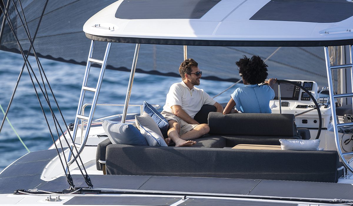 In navigazione, durante il nostro test a Cannes, abbiamo rilevato velocità molto buone (considerando la brezza leggera che ha oscillato quasi sempre tra i 5 e i 6 nodi), spesso vicine all’intensità del vento nelle andature fra i 70 e i 90 gradi di reale. Le manovre sono semplici e fluide, condotte dalla plancia collocata sul fly in cui tutto è a portata di mano dello skipper. Si entra in virata con l’inerzia tipica dei multiscafi da crociera uscendone senza intoppi, pur in presenza di poco vento e quindi perdendo nell’angolo morto quasi metà della velocità di ingresso.