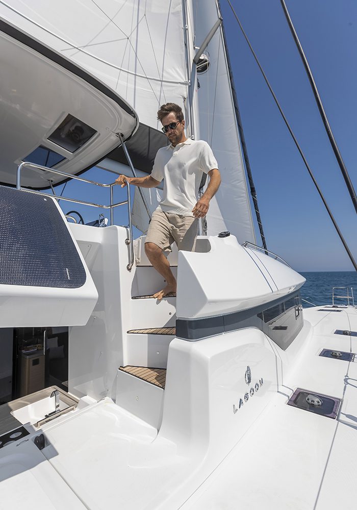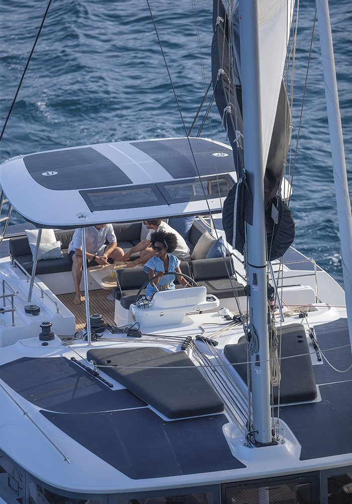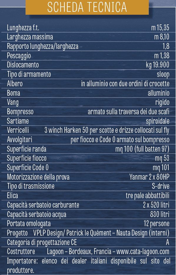Inoltre, il centro velico avanzato è una dichiarazione di ritorno alle origini: siamo a bordo di un catamarano, dunque inutile esasperare il piano velico alla ricerca di chissà quali angoli di bolina. E 60 gradi di apparente al vento non sono poi male, anzi, sono una buona moneta con cui pagare comfort, stabilità e discrete velocità.