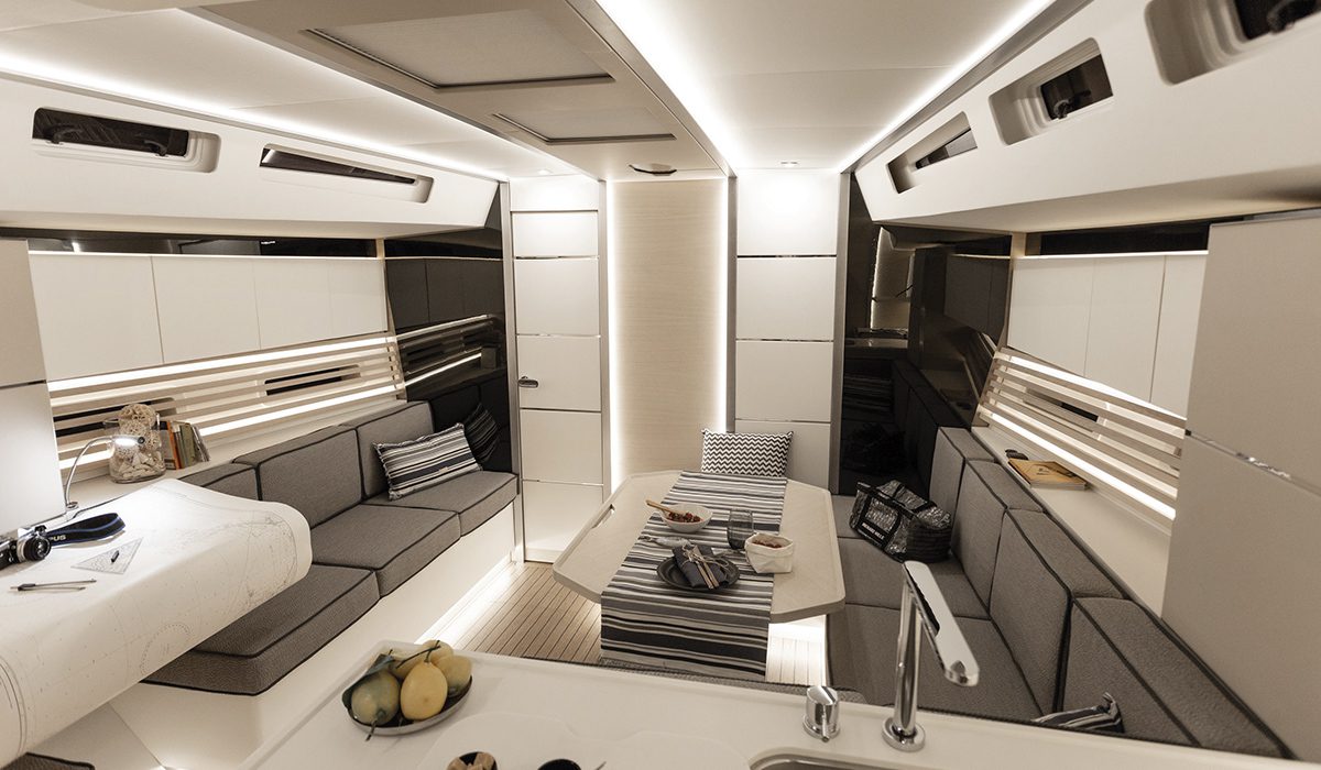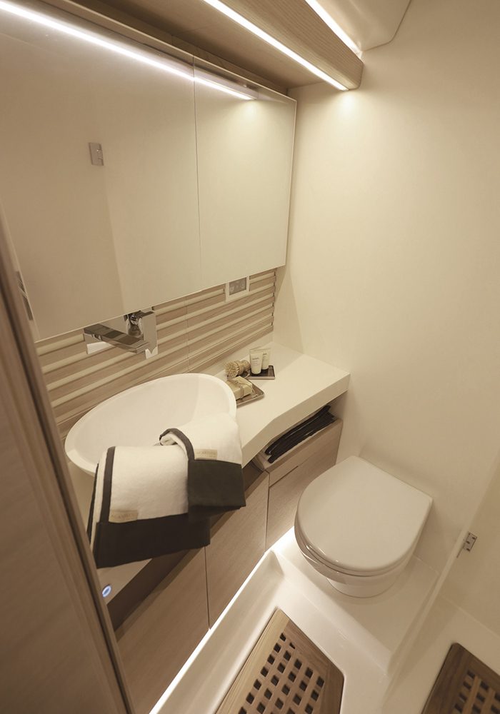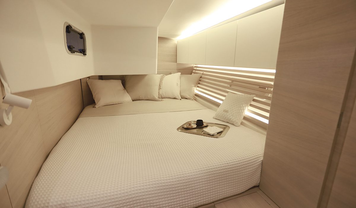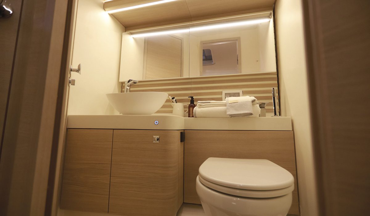 Con un apparente di 50 gradi riusciamo a tenere una velocità di 7–8 nodi. Il mare si fa sentire e sottocoperta tutto diventa diverso. Allora saltano agli occhi i tientibene lungo la discesa, dai quali ci si può scostare per usare quello verticale dopo l’ingresso del bagno per poi utilizzare il bordo rialzato del tavolo. Gli spostamenti con mare formato sono sicuri. Si può scegliere se dormire in quadrato, sulla sinistra o sulla dritta, visto che entrambi i divani lo consentono, o nelle cabine. L’uso delle due toilette è agevolato dalle dimensioni che, seppure non risicate, definiscono ambienti alquanto raccolti, giusti per potersi muove senza volare da una parete all’altra. Anche l’uso della cucina, seppure in uno spazio molto ampio, è agevole ma può essere migliorato attrezzando una cinghia sotto i fornelli per sorreggersi nelle rollate più forti.