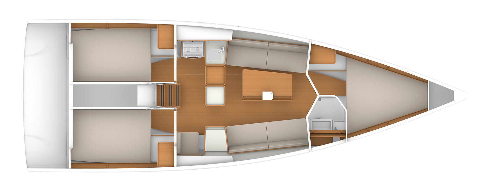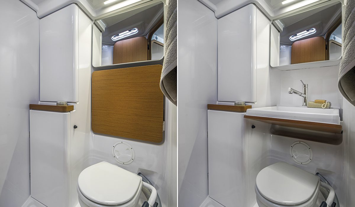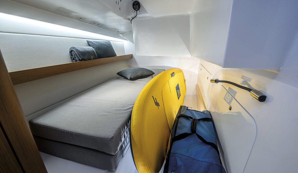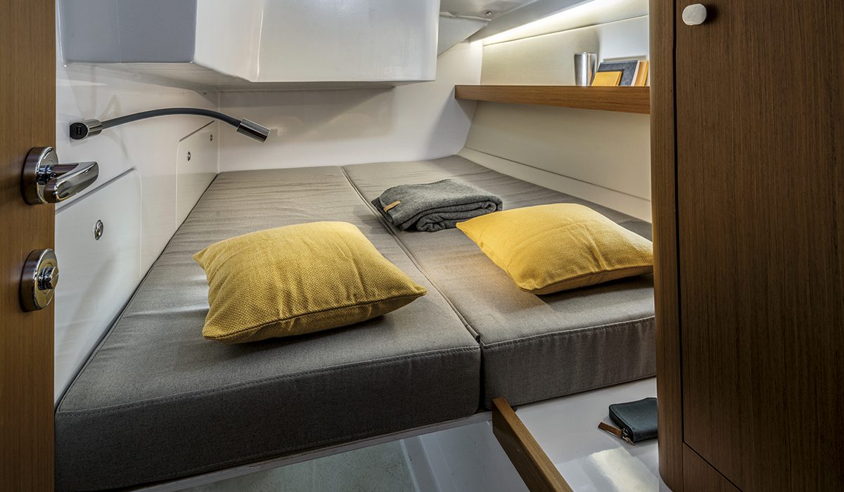 Tre le cabine: due gemelle a poppa, una a prua, con la classica cuccetta triangolare, per un totale di sei posti letto. Non grande ma assai ingegnosa l’unica toilette che, più o meno all’altezza del mascone di dritta, è dotata di un ampio lavabo ribaltabile che la rende facilmente fruibile.