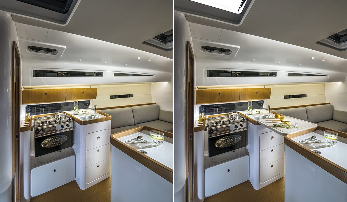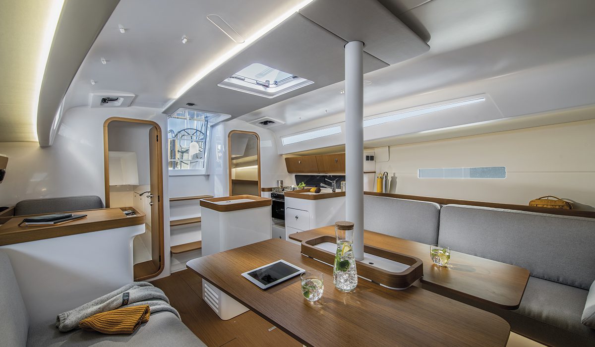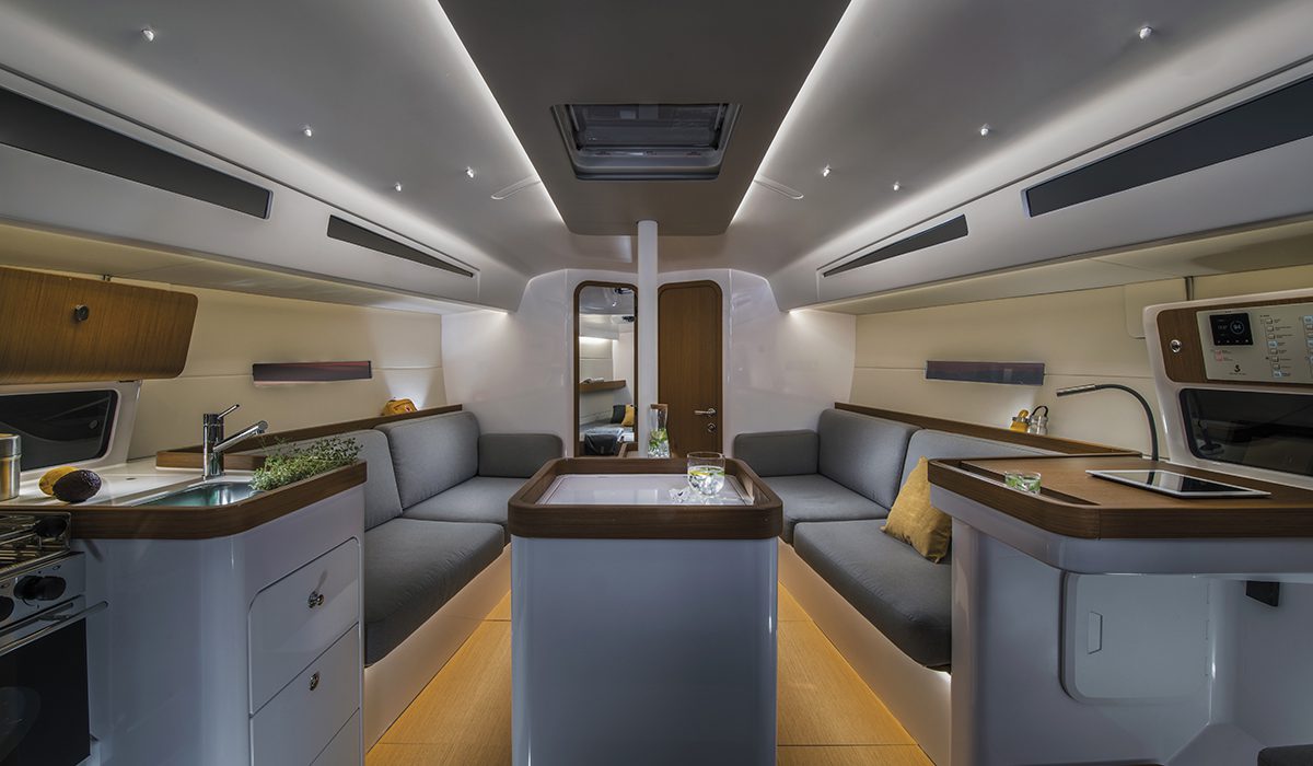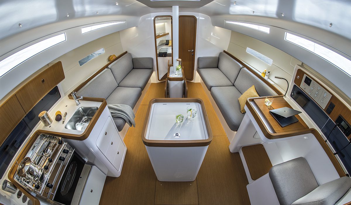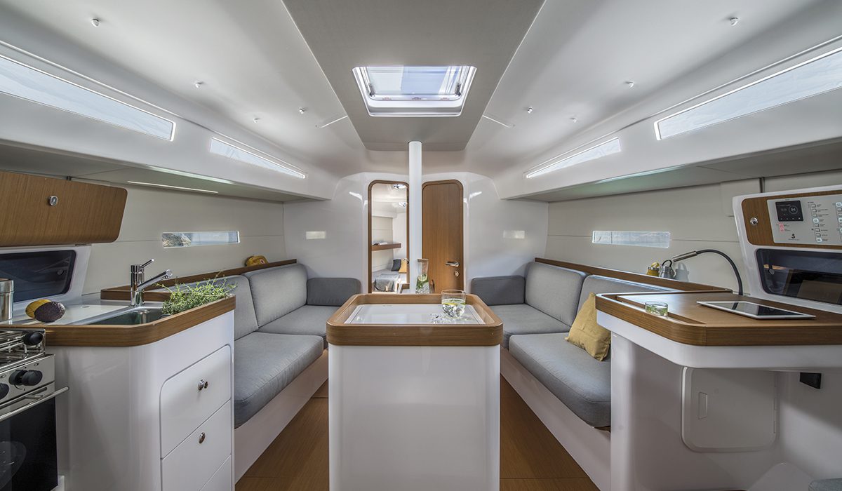 Tornati alla base, ci riposiamo sotto coperta accomodandoci sui due lunghi divani a murata e godendo della grande ampiezza del quadrato, quasi amplificata dall’ottima luminosità naturale consentita dalle lunghe finestrature della tuga e dall’osteriggio centrale, sotto il quale si trova un bel frigorifero a pozzetto “a isola”. Ai suoi lati, una comoda cucina a “L” a sinistra e un ampio tavolo da carteggio a dritta.