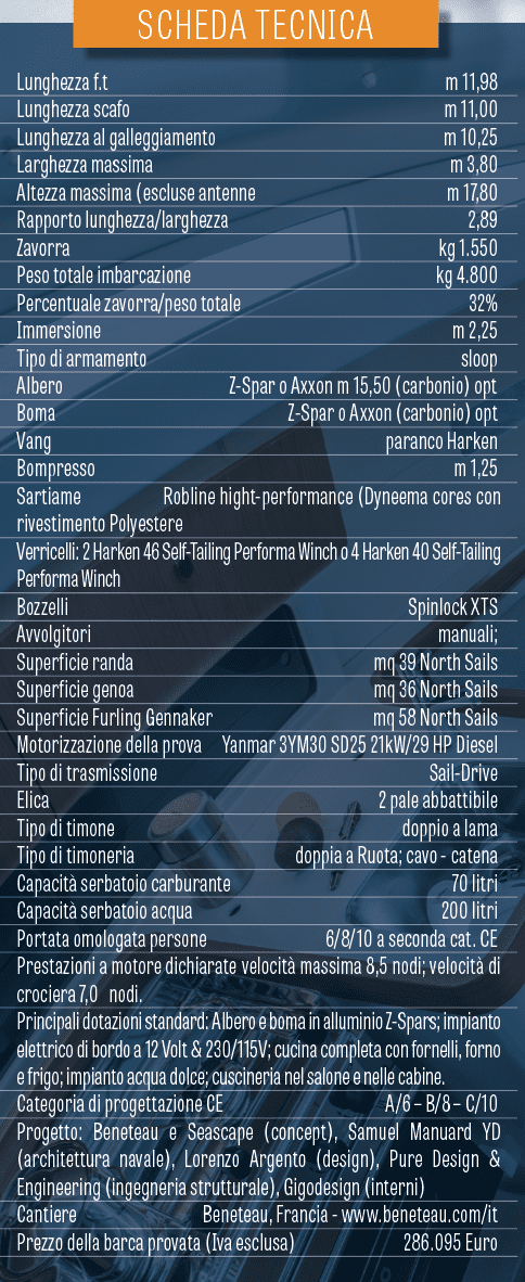 L’obiettivo primario di Beneteau era quello di creare uno sloop di 36 piedi che riducesse al minimo il divario tra lo sviluppo high-tech di una barca da regata e le soluzioni più adatte a una barca da crociera. Per raggiungerlo, il prestigioso staff di progettisti coordinato dal cantiere ha posto come condizione iniziale un valore dislocamento/lunghezza – il cosiddetto D/L ratio – pari a 100, tale da posizionare lo scafo tra la categoria a dislocamento ultraleggero e quella del dislocamento leggero.