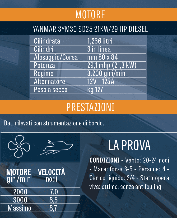 Ciò si traduce in una conduzione sicura e razionale anche nelle condizioni meteomarine non facili che abbiamo detto, con la barca che, effettivamente, tende a planare sulle andature portanti, restando tuttavia sotto il pieno controllo delle due pale del timone. In bolina larga, con la carena ben piantata sul ginocchio e le vele opportunamente ridotte, viaggiamo quasi sempre tra i 9 e i 10 nodi, spesso sfiorando i 12. Surfando su un‘onda, il log indica incredibilmente i 18. È davvero un gran divertimento.