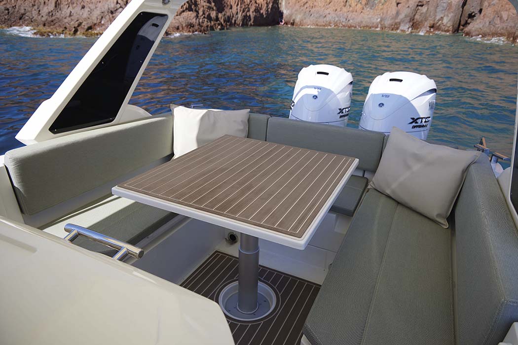 La coperta del il gommone Clubman 32 richiama quella del modello precedente, soprattutto a poppa dove rimane la dinette in pianta a “C” con blocco cucina collocato alle spalle delle sedute dei piloti. A prua, la modifica è sostanziale.