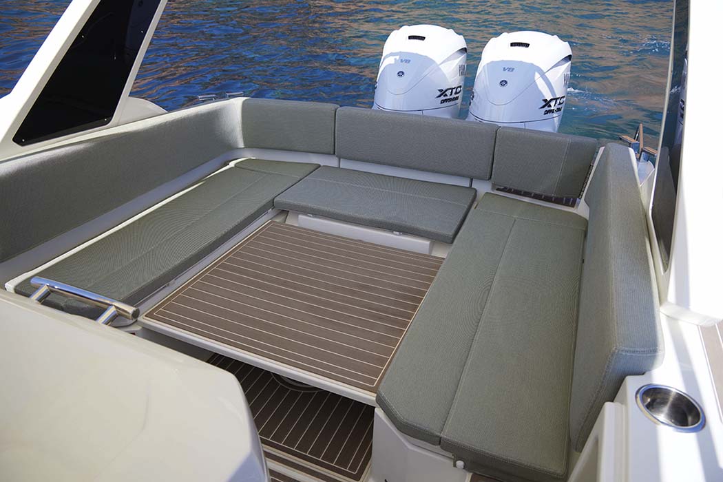 Il ponte è stato rialzato per dare spazio alla cabina e tutta la zona è adibita a prendisole con un’imbottitura della parte prodiera della console che funge da chaise-longue.