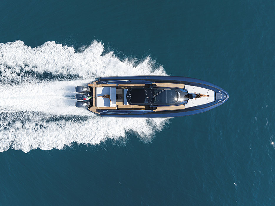 Si tratta di un battello di classe premium con finiture al top, e questo è messo ben in mostra dalla pontatura in teak massello e dalla verniciatura dotata di una pellicola che ne preserva le qualità nel tempo, ma anche dalle dotazioni elettroniche presenti in plancia dove spiccano gli MFD della Garmin.