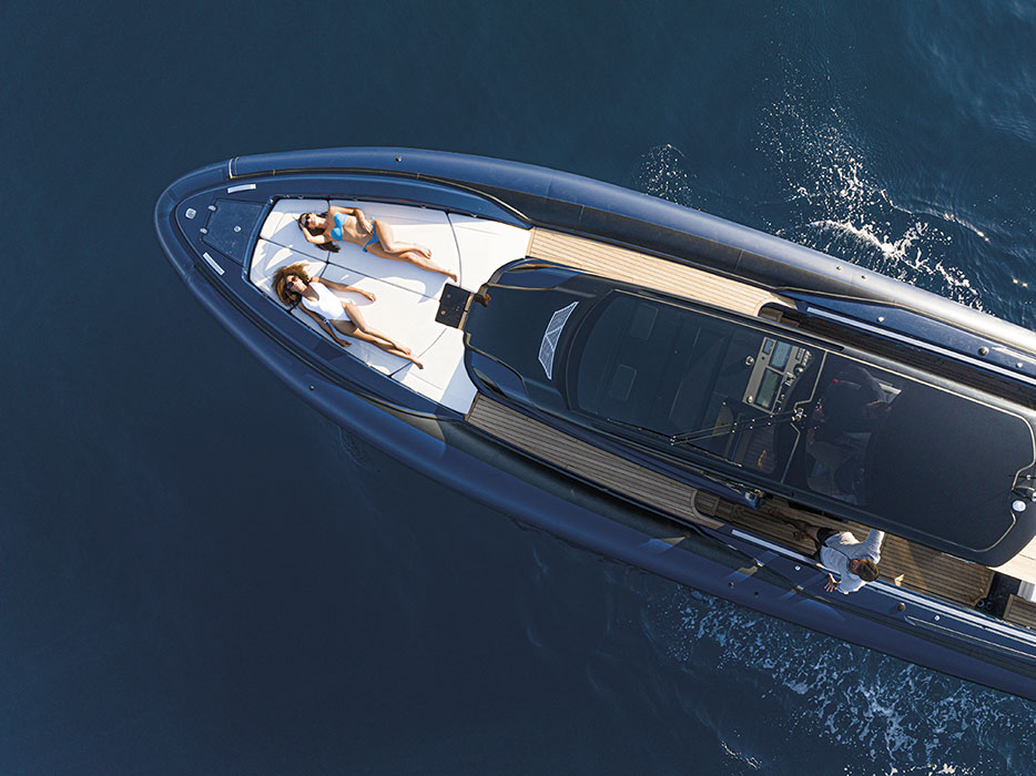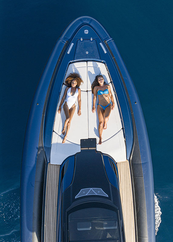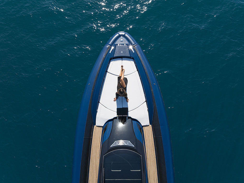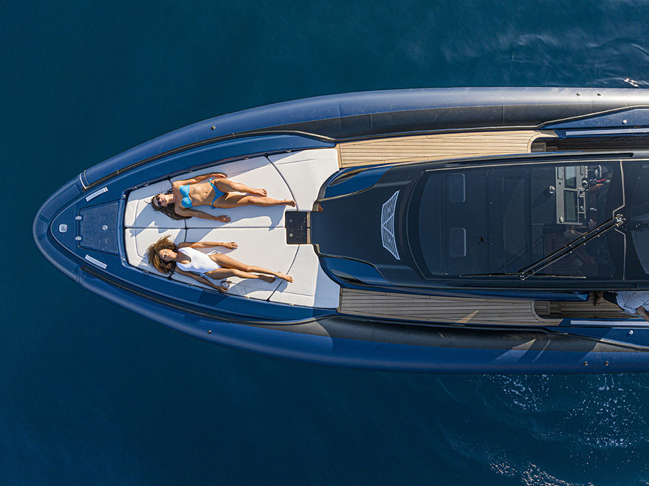 In questa sua nuova veste, la barca offre un disegno del pozzetto che lascia più libertà di movimento, con ampi camminamenti laterali che abbracciano il prendisole a isola che ingloba un divanetto con schienale ribaltabile, il quale, insieme a un secondo sofà contrapposto e a due tavolini, crea un ambiente ideale per i momenti di convivialità supportati dal mobile cucina con piastra a induzione e frigorifer e ombreggiati nelle ore più calde del giorno dal tendalino con pali in fibra di carbonio.