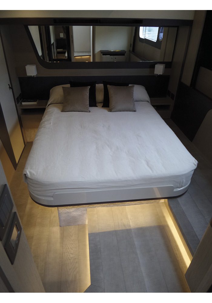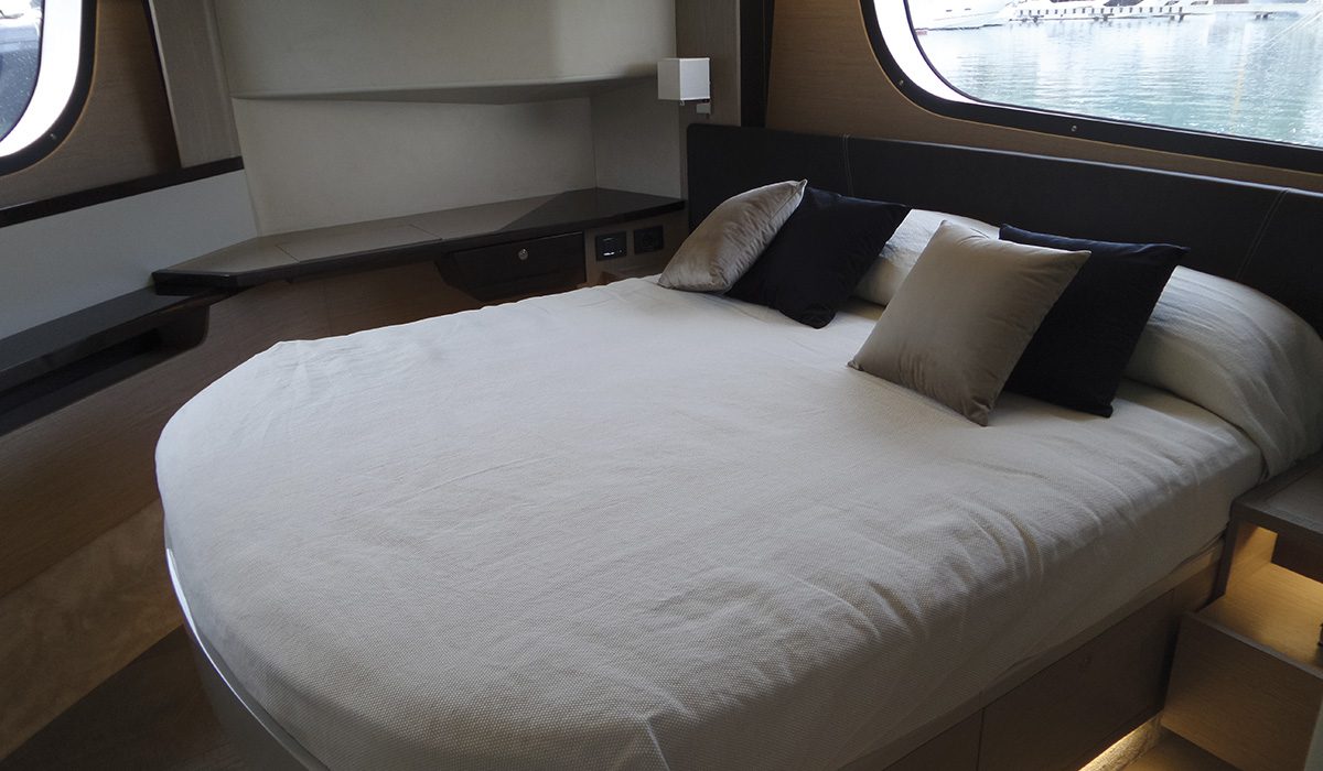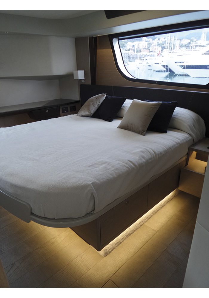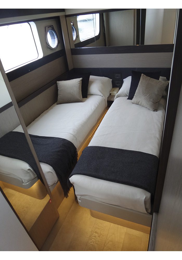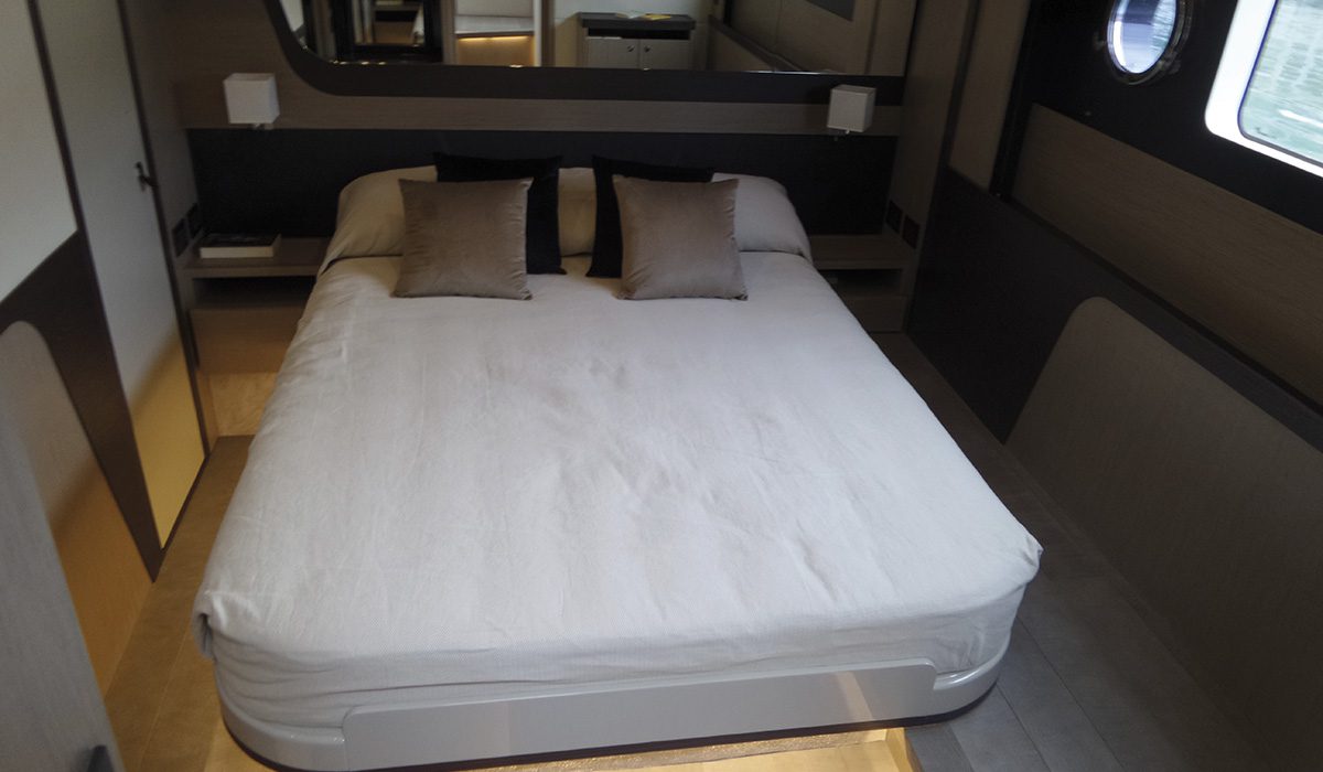 Dal pozzetto due gradini conducono alla grande plancetta, un’eccellente area prendisole a pelo d’ acqua. Attraverso sicuri passavanti si raggiunge l’area di prua, con un ampio prendisole con tre schienali reclinabili e bimini con sostegni in carbonio. Sul ponte inferiore si trovano tre cabine con due bagni, soffitti alti e luminose aperture per la luce naturale. L’armatoriale a prua, con bagno privato, offre un comfort eccezionale, soprattutto per una barca di queste dimensioni. La VIP, a mezzanave, è in realtà una seconda armatoriale, viste le dimensioni, mentre le cuccette affiancate sono a dritta.