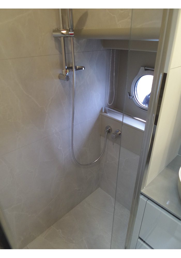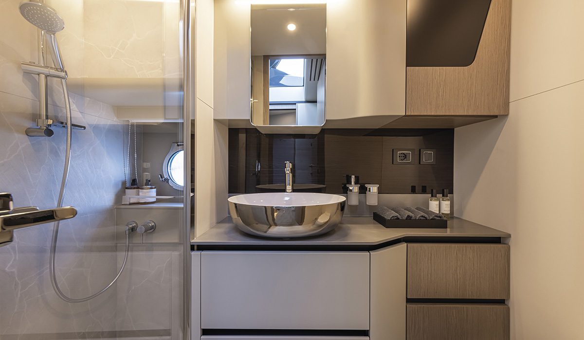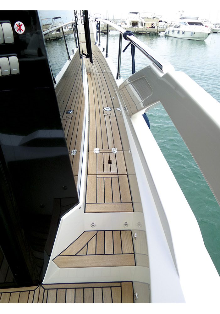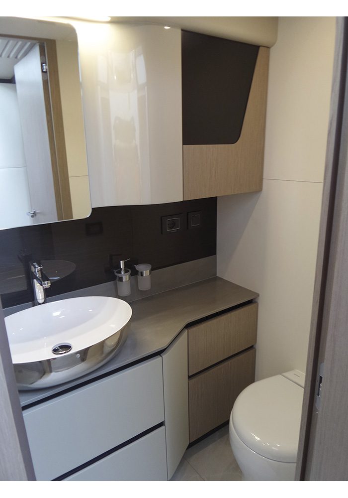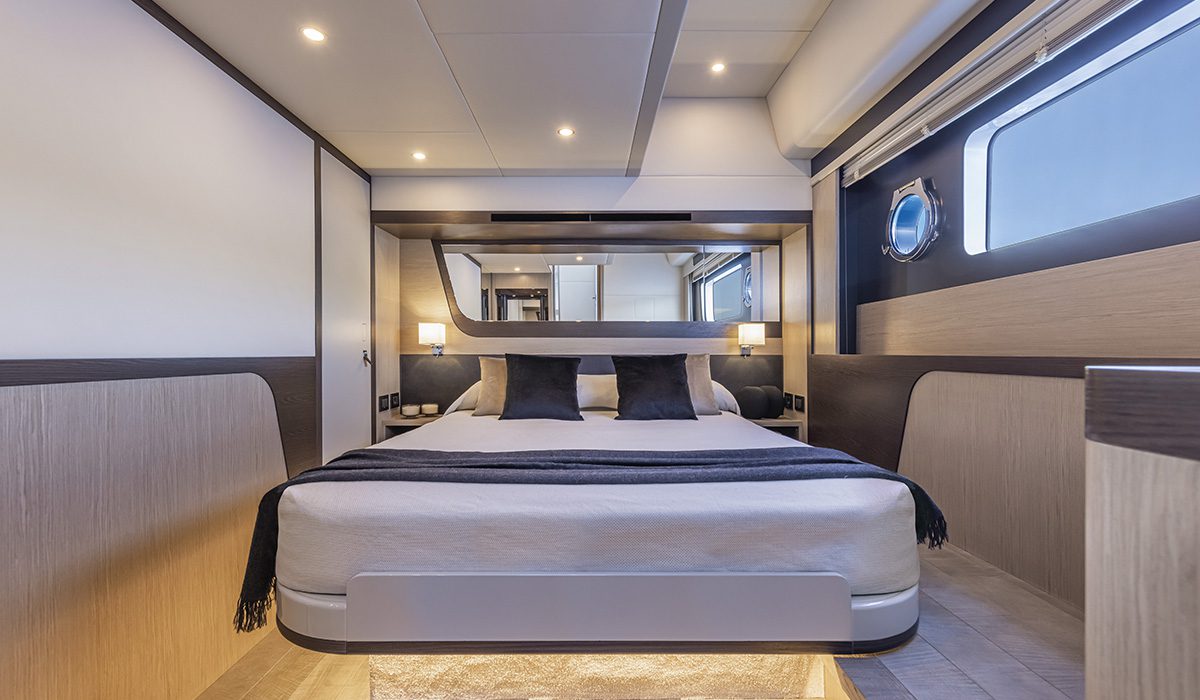 Dal pozzetto due gradini conducono alla grande plancetta, un’eccellente area prendisole a pelo d’ acqua. Attraverso sicuri passavanti si raggiunge l’area di prua, con un ampio prendisole con tre schienali reclinabili e bimini con sostegni in carbonio. Sul ponte inferiore si trovano tre cabine con due bagni, soffitti alti e luminose aperture per la luce naturale. L’armatoriale a prua, con bagno privato, offre un comfort eccezionale, soprattutto per una barca di queste dimensioni. La VIP, a mezzanave, è in realtà una seconda armatoriale, viste le dimensioni, mentre le cuccette affiancate sono a dritta.