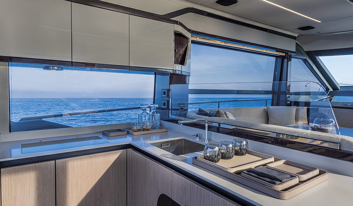 Pannelli solari, come solare è tutto l’interno di questo Coupé: raramente abbiamo potuto apprezzare una tale luminosità e una visuale panoramica a 360°. Nel salone le grandi vetrate laterali circondano tutto il ponte e offrono una visuale ininterrotta, complici le trasparenze di poppa e il parabrezza panoramico e, aprendosi elettricamente, convogliano la brezza marina generando un naturale ricircolo d’aria. Il rapporto interno-esterno è assoluto, tanto che l’imbarcazione sembra molto più grande. Il ponte principale oltre ad ospitare timoneria, estremamente comoda, e salone con due divani contrapposti, ha una cucina che unisce il living interno con l’area esterna poppiera.