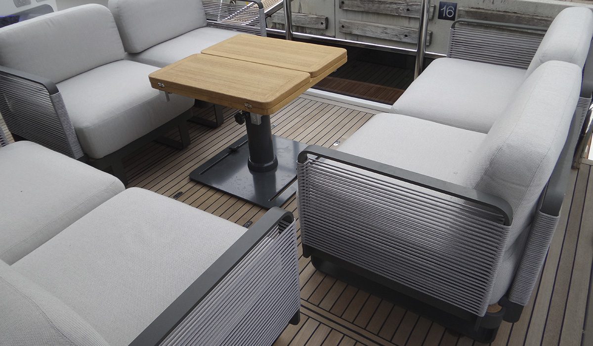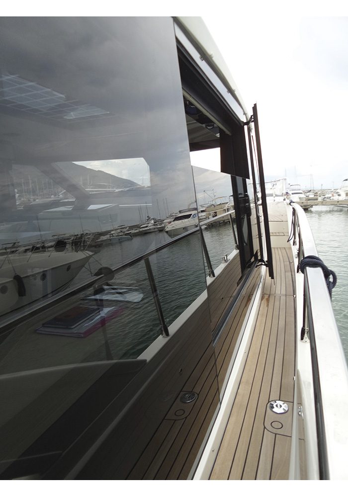 Il pozzetto, ombreggiabile con tendalino elettrico che fuoriesce dall’hard top, è libero da barriere visive e non presenta elementi fissi: è perciò utilizzabile liberamente con diverse configurazioni, secondo le esigenze di bordo. L’apertura delle falchette laterali offre una visuale diretta sul mare e i parapetti vetrati a poppa permettono la vista anche dal salone e dalla timoneria.