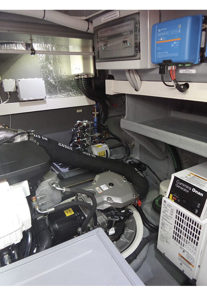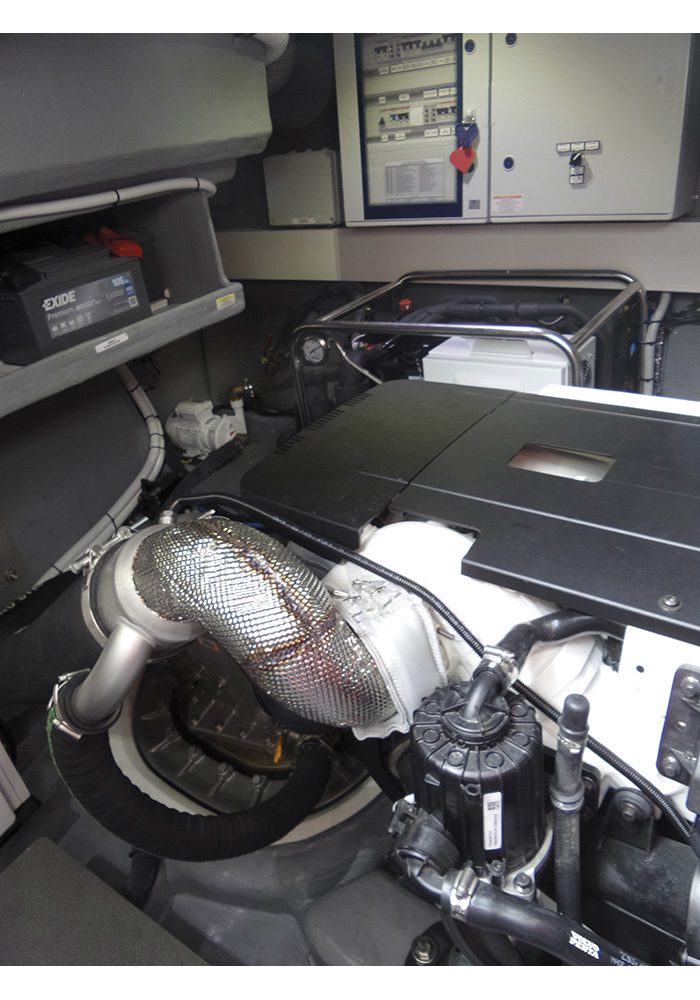 La sala macchine, davvero comoda, ospita due Volvo Penta IPS650 per 960 HP complessivi, che forniscono tutta la spinta che serve: si raggiunge la planata in soli cinque secondi e si superano agilmente i 28 nodi. Sui 13 nodi, appena superata la velocità di planata, i consumi diminuiscono per poi arrivare a 6 litri/miglio a 24,7 nodi. Al timone, nonostante le condizioni di mare molto formato, lo scafo si rivela docile, grazie alla marcata stabilità direzionale, e capace di accostate rapide e precise a tutte le andature, una agilità davvero da sportiva di classe.