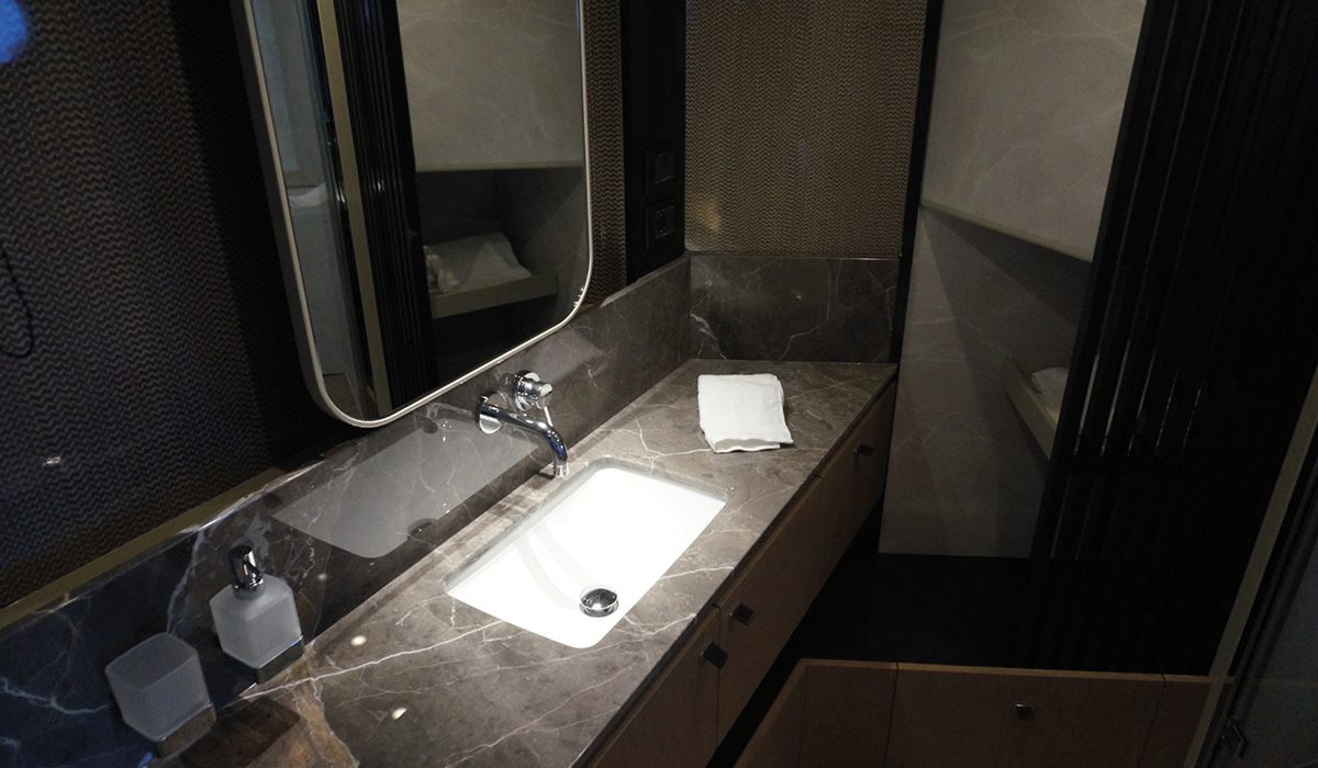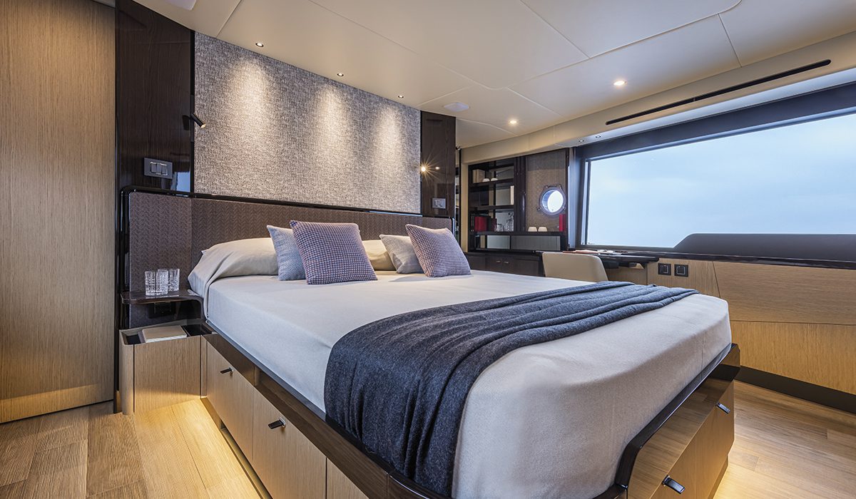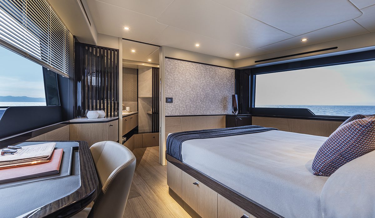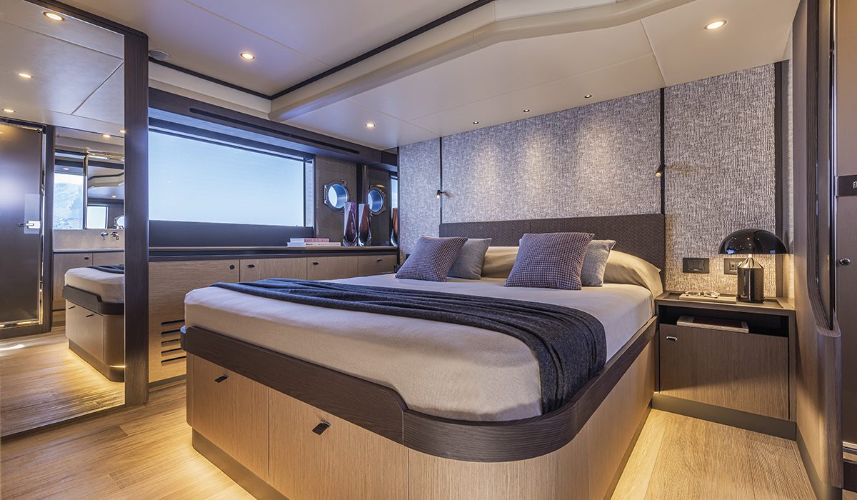 Sottocoperta, la cabina armatoriale è sorprendente sia per dimensioni, favorite dai grandi volumi di prua, sia per finiture e luminosità. Le finestrature sono le più ampie dell’intera imbarcazione, consentendo una vista ineguagliabile. L’ampia toilette sfrutta intelligentemente anche l’estrema prua, sottostante al gavone della catena, con utili vani a giorno.