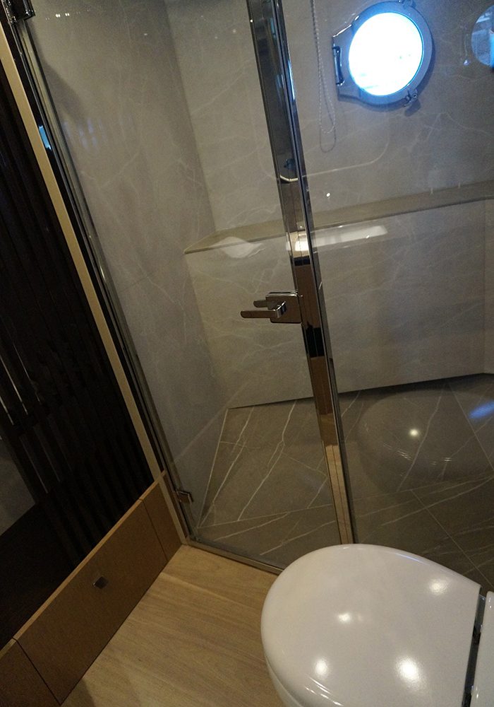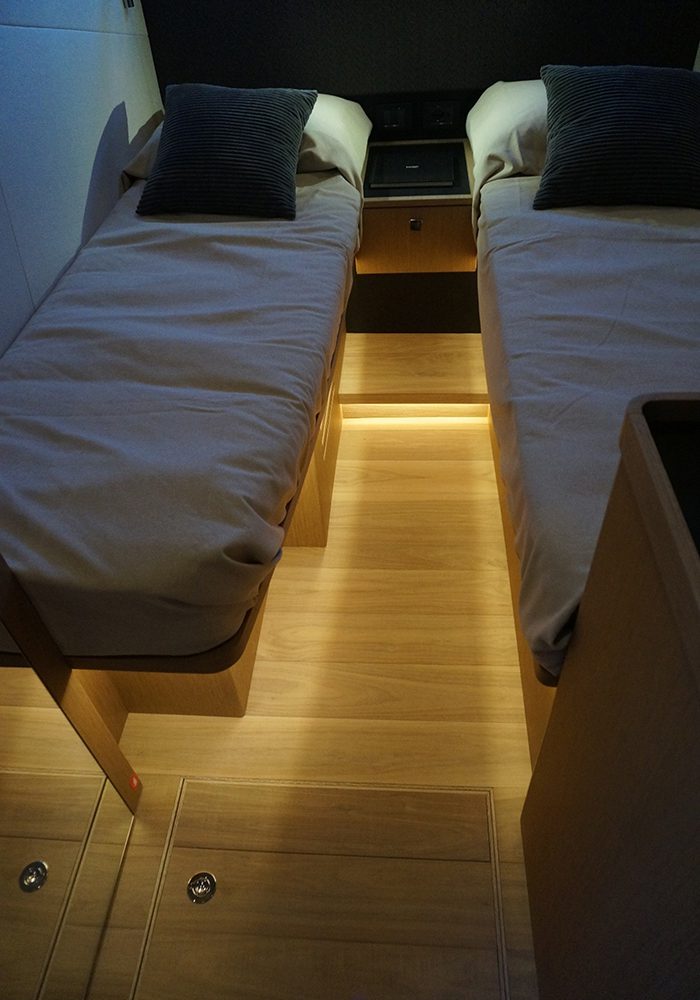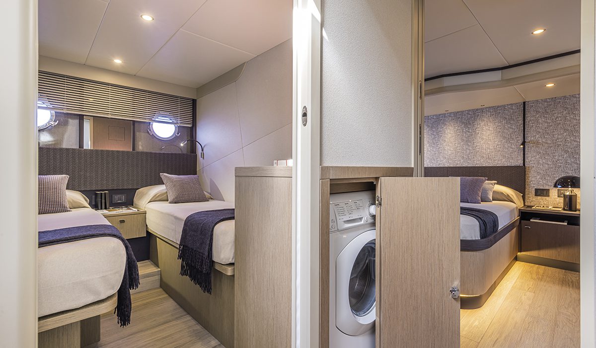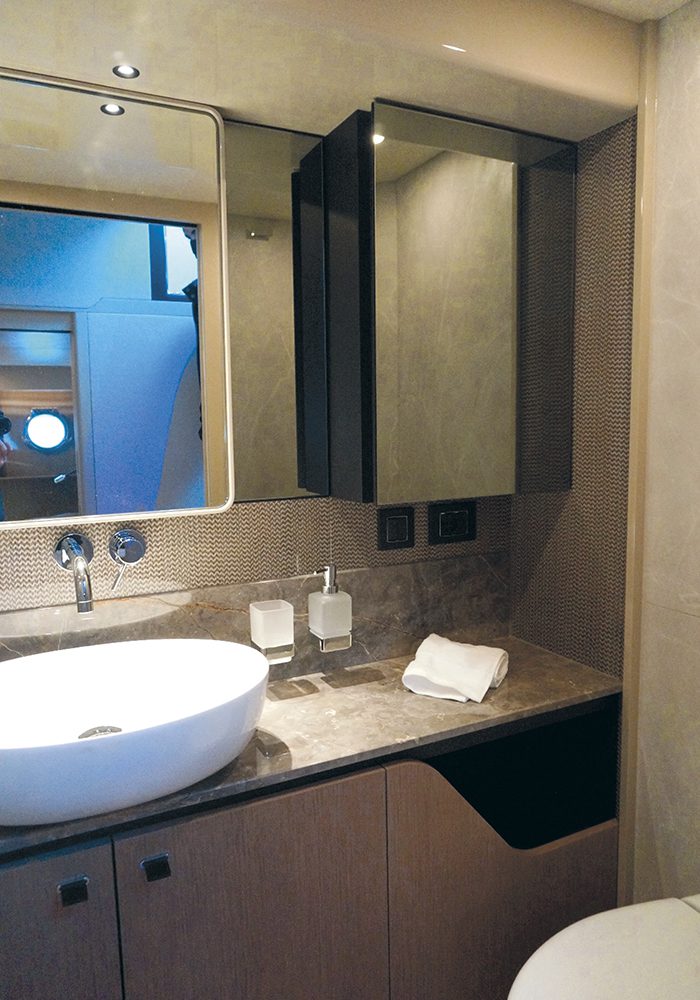 La Vip, a poppa, a tutto baglio, è in effetti una vera e propria padronale, anch’essa con un super bagno en suite e letto king-size. A centro barca l’ampia cabina ospiti ha due letti di dimensioni standard: la sua toilette di riferimento è nel corridoio, per poter svolgere agevolmente anche la funzione day head. Tramite un tambuccio a poppa si accede alla cabina equipaggio, con due letti, armadi, wc e doccia.