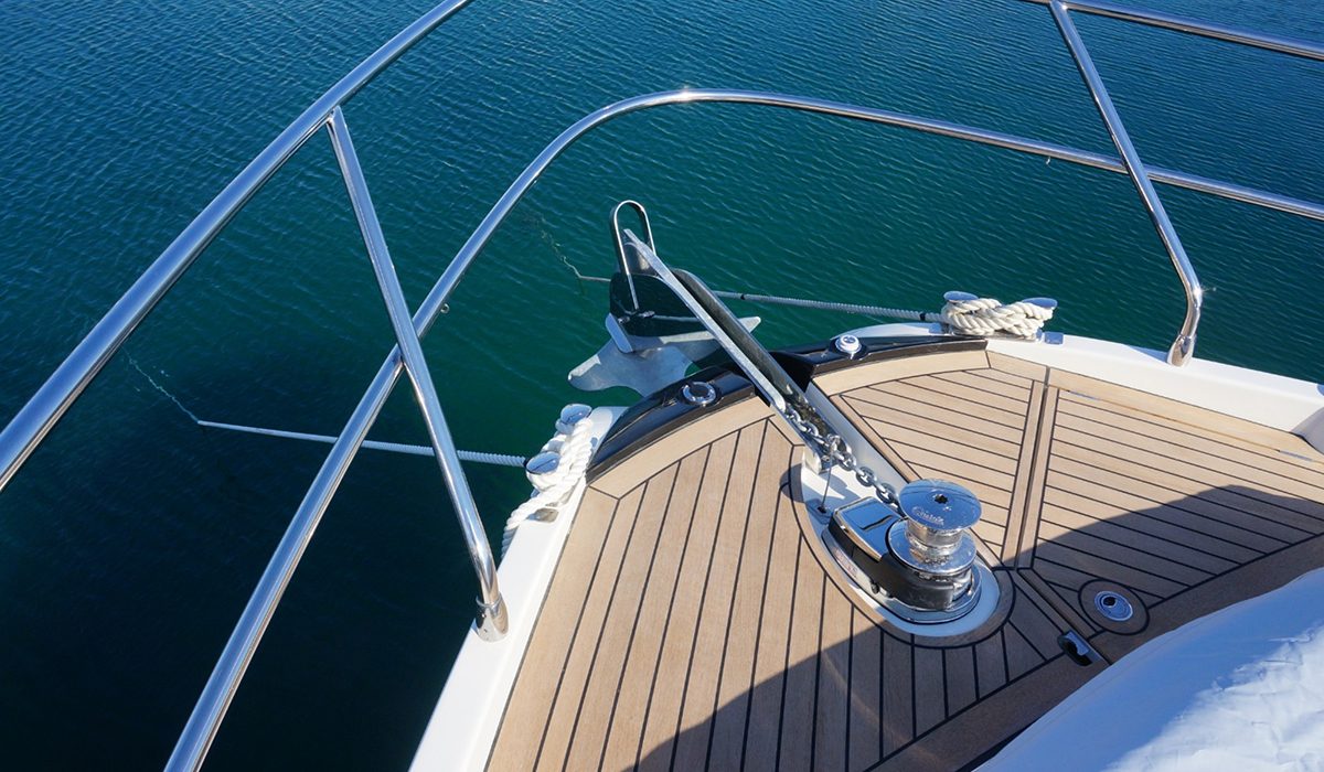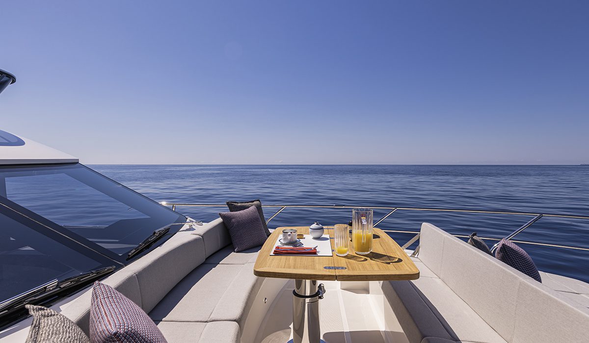 Percorrendo i comodi passavanti, si giunge a prua dove due divani contrapposti, con tavolo centrale a scomparsa, creano un’ampia area lounge che solitamente si trova su imbarcazioni di dimensioni ben maggiori. Il divano di prua ha schienali ribaltabili per aumentare ulteriormente la superficie dei già ampi prendisole prodieri. Il tutto è ombreggiabile con un bimini teso su pali di carbonio.