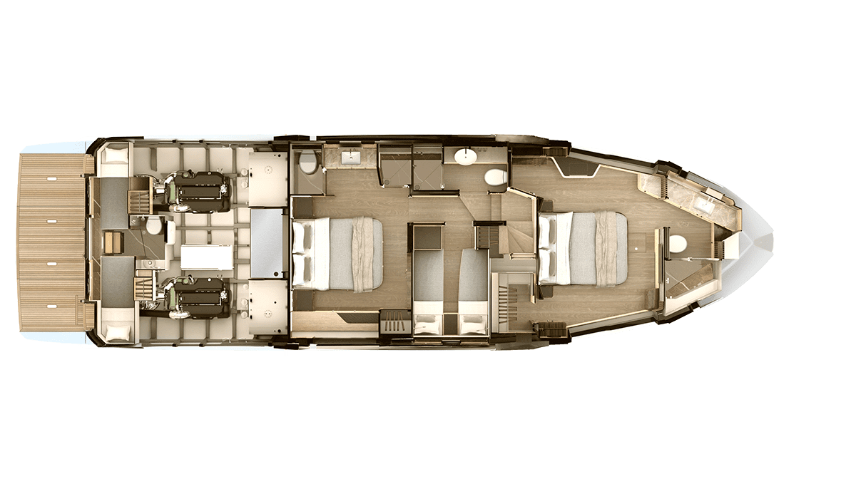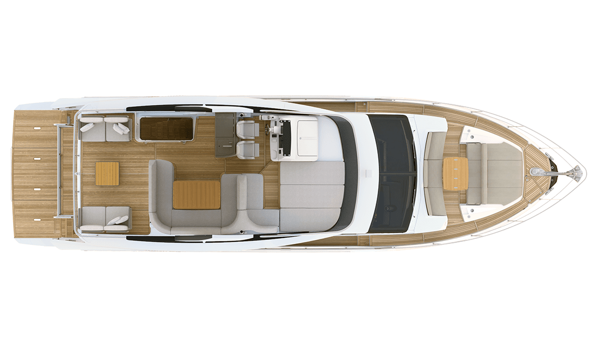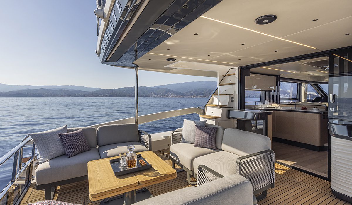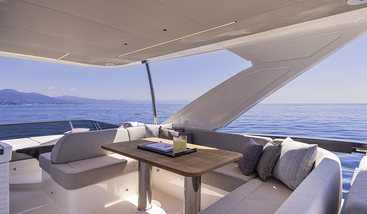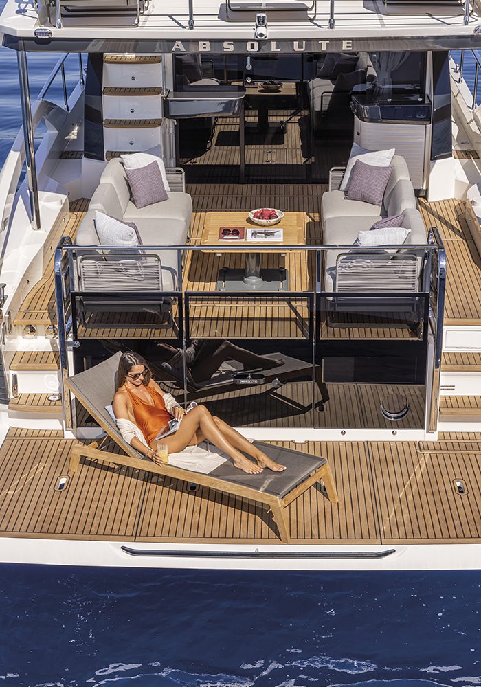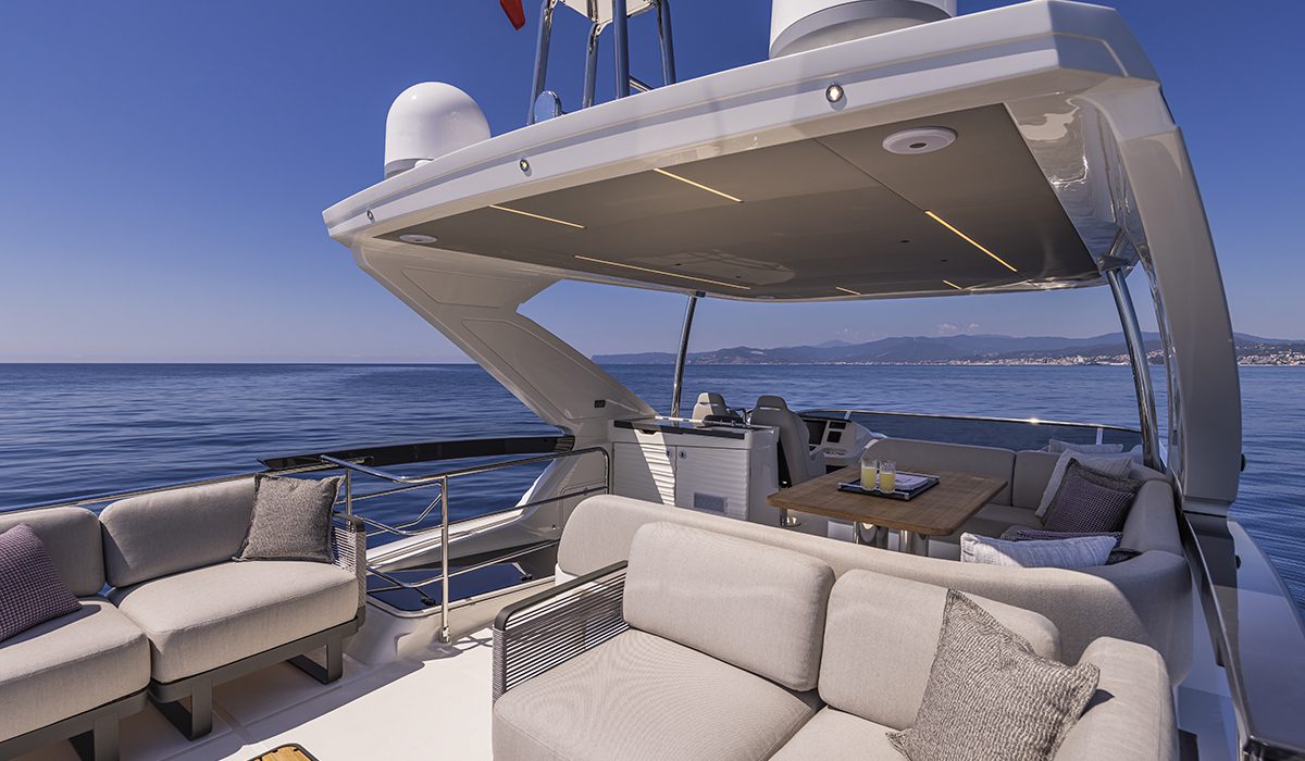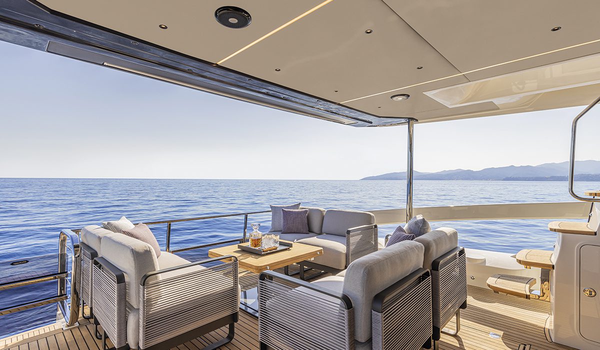 Il pozzetto, ombreggiabile con tendalino elettrico che fuoriesce dall’fly, è libero da barriere visive e non presenta elementi fissi: è perciò utilizzabile liberamente in diverse configurazioni, secondo le esigenze di bordo. L’apertura delle falchette laterali offre una visuale diretta sul mare e i parapetti vetrati a poppa permettono la vista anche dal salone e dalla timoneria. Dal pozzetto i tre gradini conducono alla grande plancetta: un’eccellente area prendisole a pelo d’acqua.