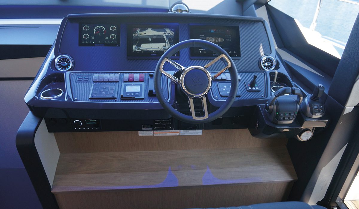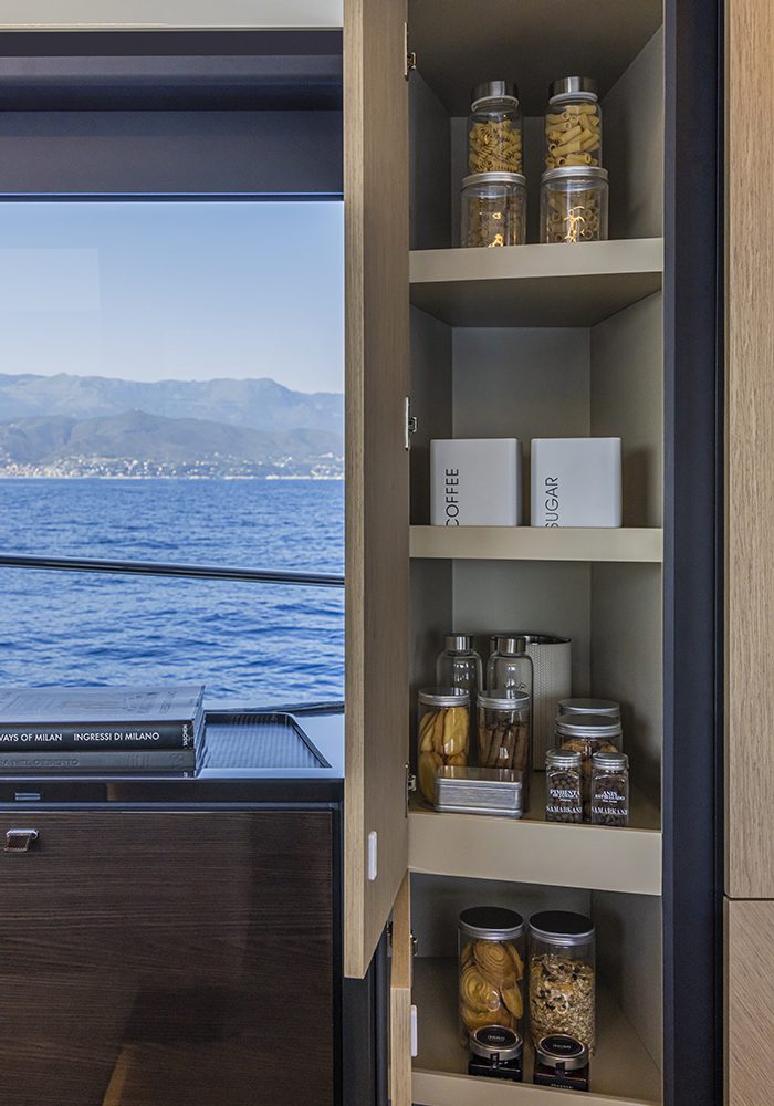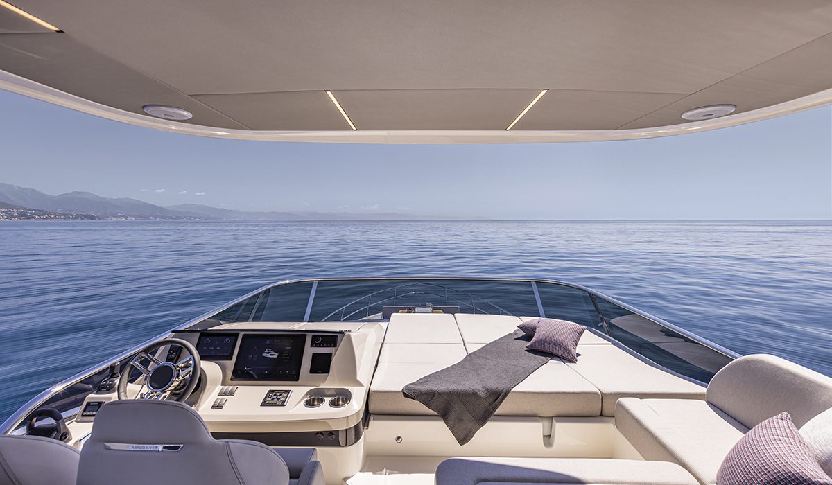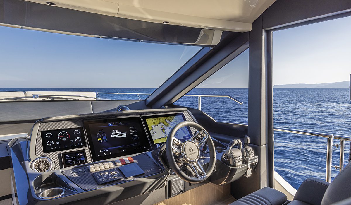 L’innovazione non si ferma al design e sposa la sostenibilità: i pannelli solari integrati sul T-Top forniscono gli 1,5 kW sufficienti ad alimentare i servizi di bordo all’ancora a generatore spento, dunque in totale silenzio; le finestre del ponte principale, apribili elettricamente, forniscono una circolazione d’aria naturale, piacevole alternativa all’aria condizionata. Grande lo sforzo tecnologico, come ad esempio per il Volvo Assisted Docking, davvero incredibile quando in manovra compensa con prontezza e precisione fattori perturbanti come vento e corrente.