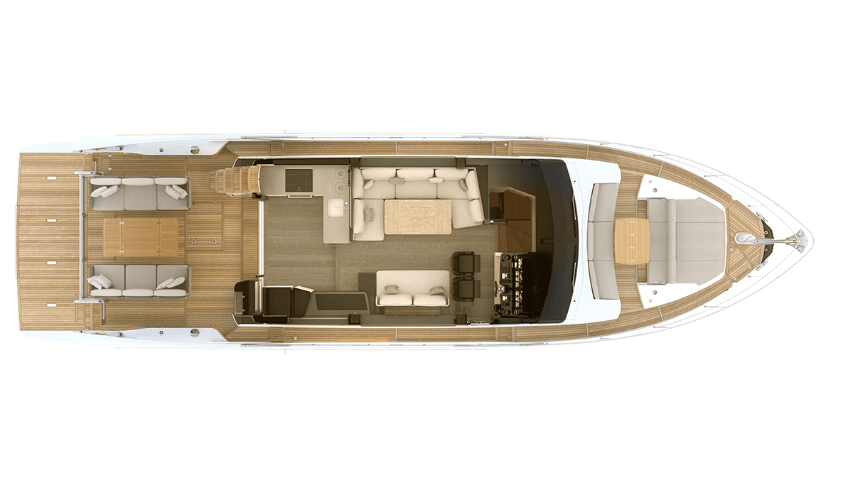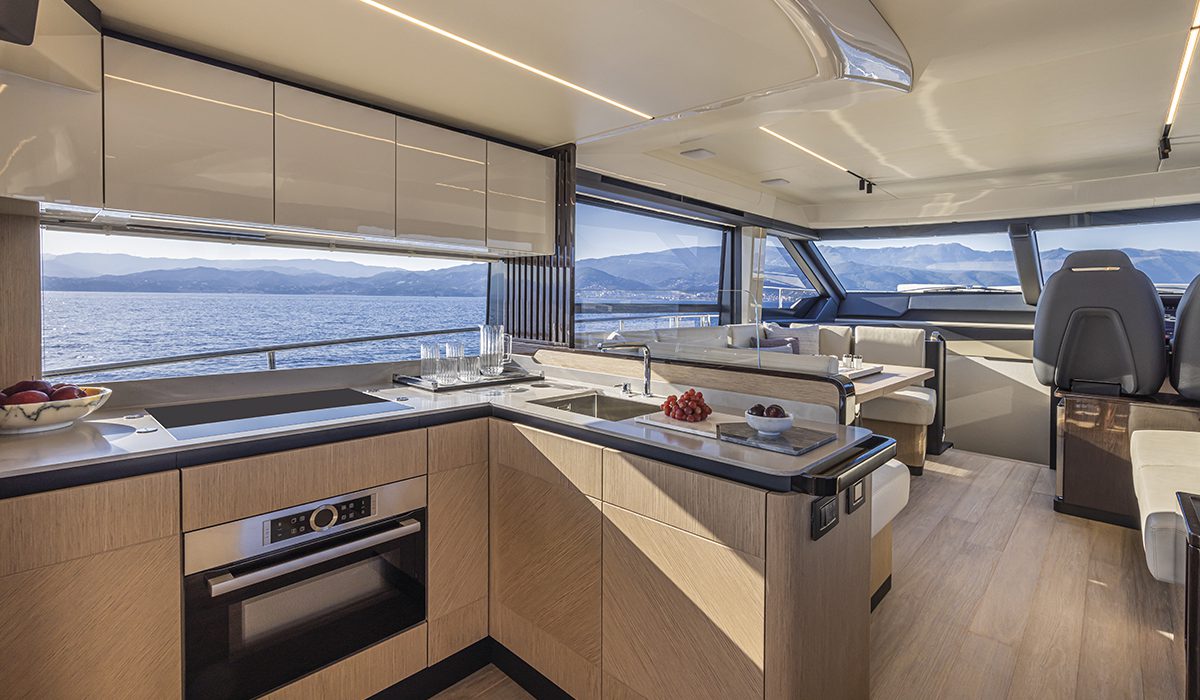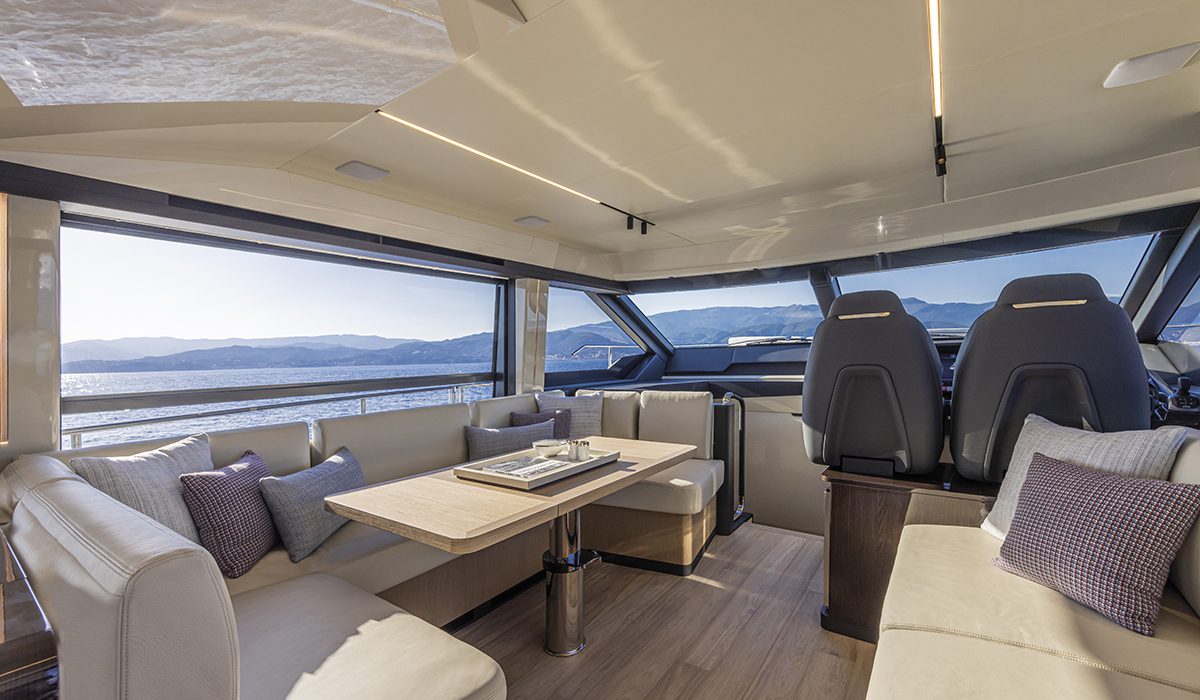 Sul ponte principale il salone centrale, che ospita la postazione di guida con due ampi sedili ergonomici, è dominato da un grande divano a “C” che, insieme a un divano laterale, crea un grande spazio per la socializzazione o per la visione del televisore pop-up. La cucina, con pianta a “L”, è separata dal salone per mezzo di una vetrata a mezza altezza a scomparsa. Ulteriori vetri scorrevoli la separano dalla dinette esterna, creando una commistione tra interni ed esterni assai fruibile.