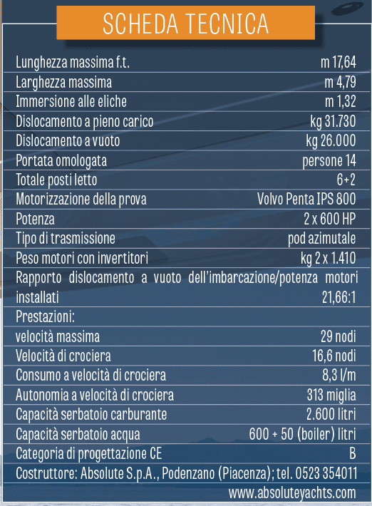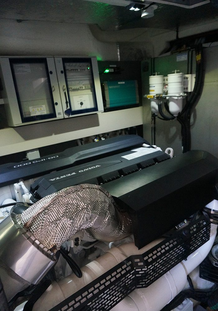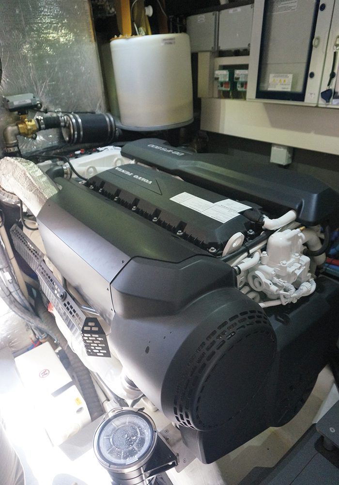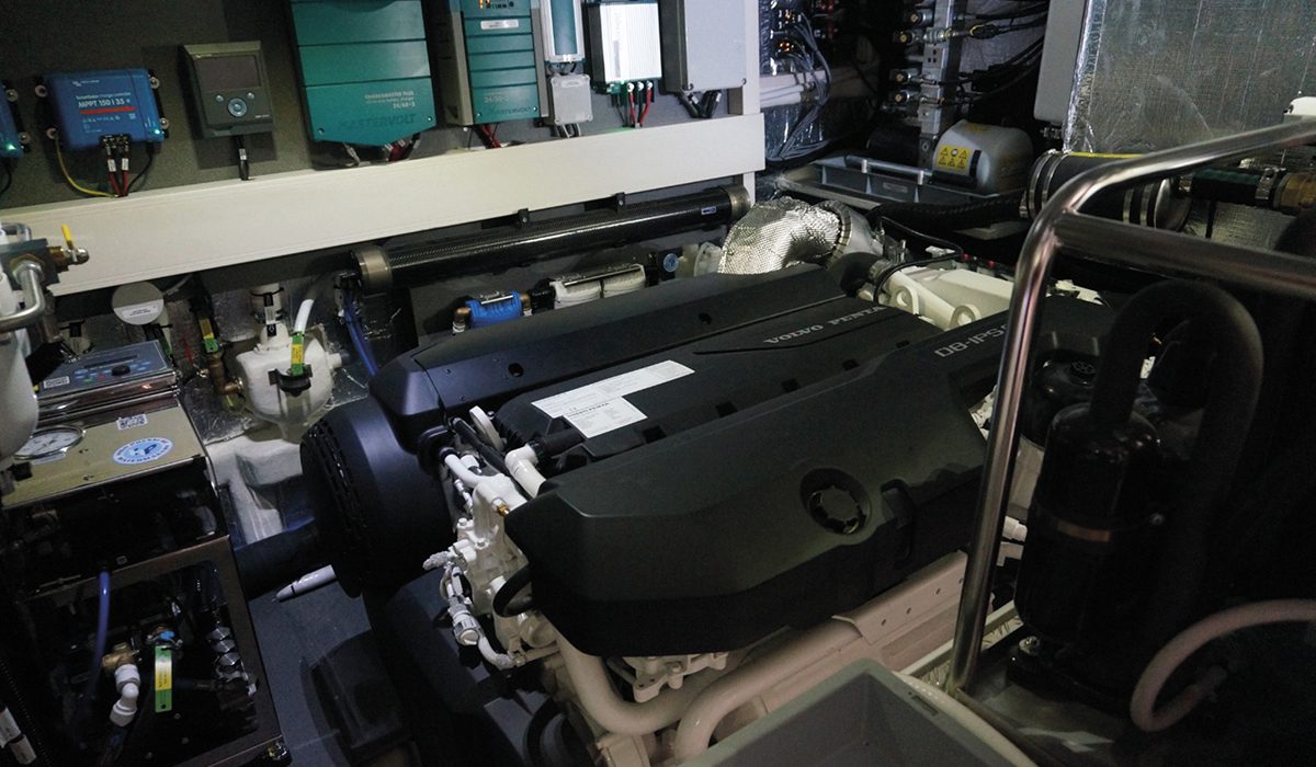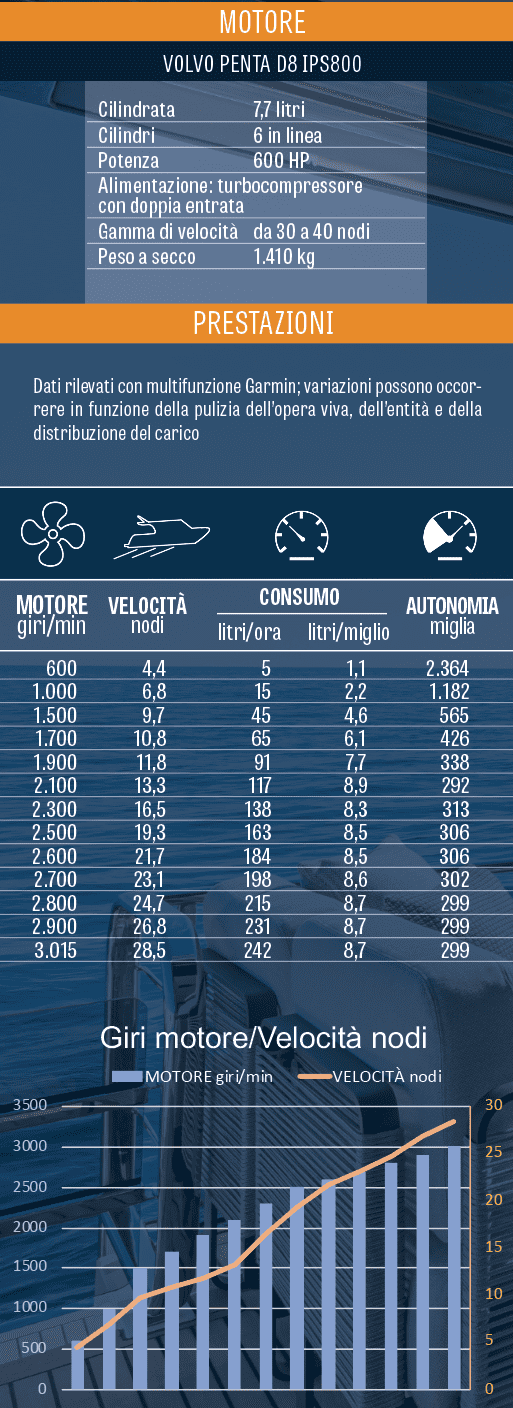 La sala macchine, molto ampia, ospita due Volvo Penta IPS800 per complessivi 1200 HP, che forniscono tutta la spinta che serve: si raggiunge la planata in soli 5 secondi e si superano agilmente i 28 nodi. La principale sensazione al timone è quella di una grande docilità, fondata su una marcata stabilità direzionale e su una sorprendente capacità evolutiva.