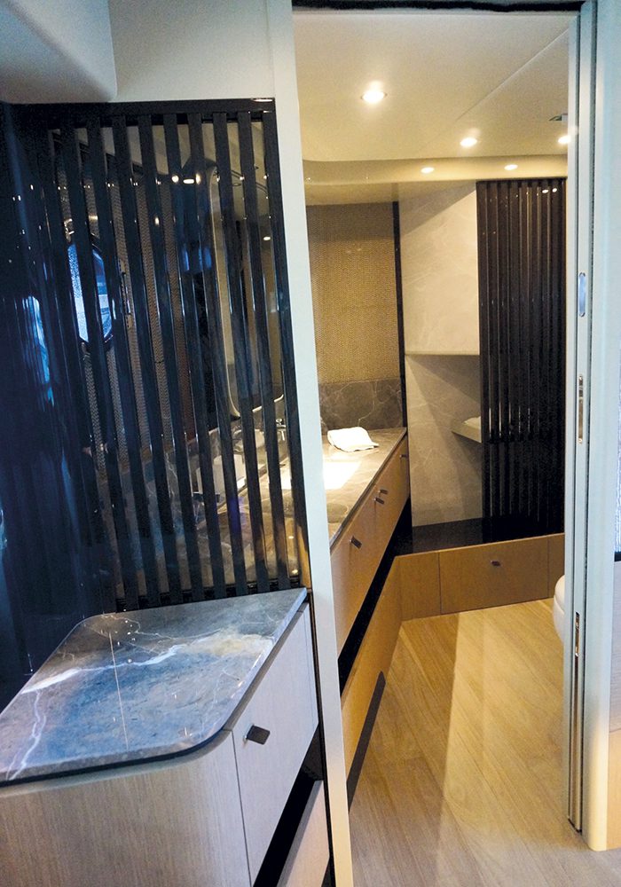 Stessa sensazione “oversize” salendo sul flybridge, davvero immenso, dotato di ampi divani, mobile bar/cucina, divani componibili a poppa, prendisole e una plancia di comando a due posti assai completa, fiancheggiata da un comodo divano a “L”.