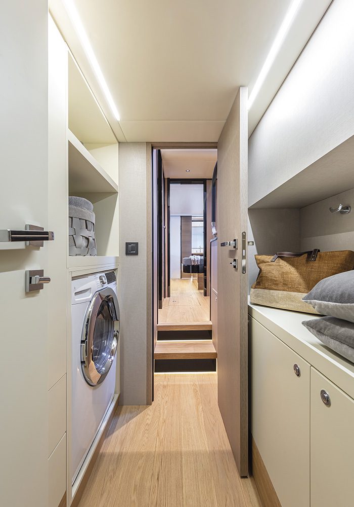 Una soluzione resa possibile dalla collocazione più avanzata della cabina equipaggio che, posta sulla dritta e dotata di due letti, ha un ingresso completamente separato. Nella versione standard, tutto quel volume è dedicato allo storage.
