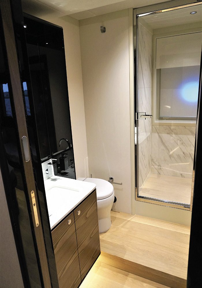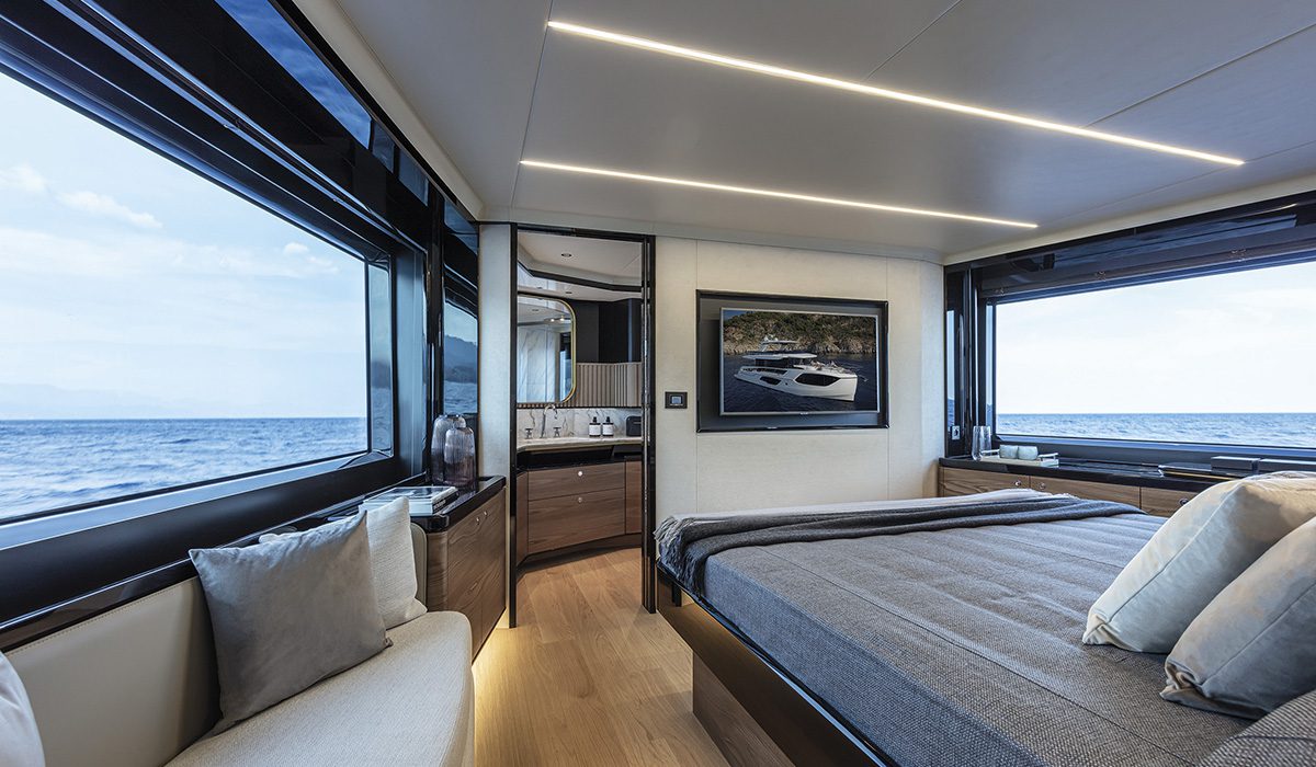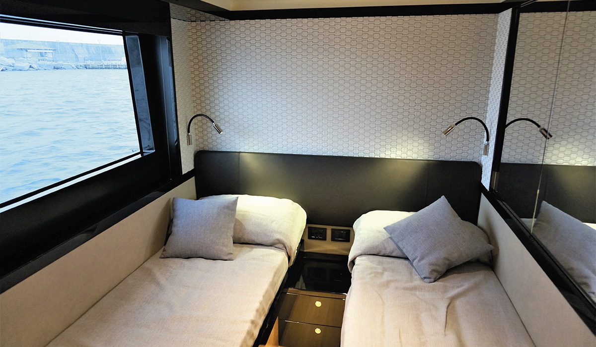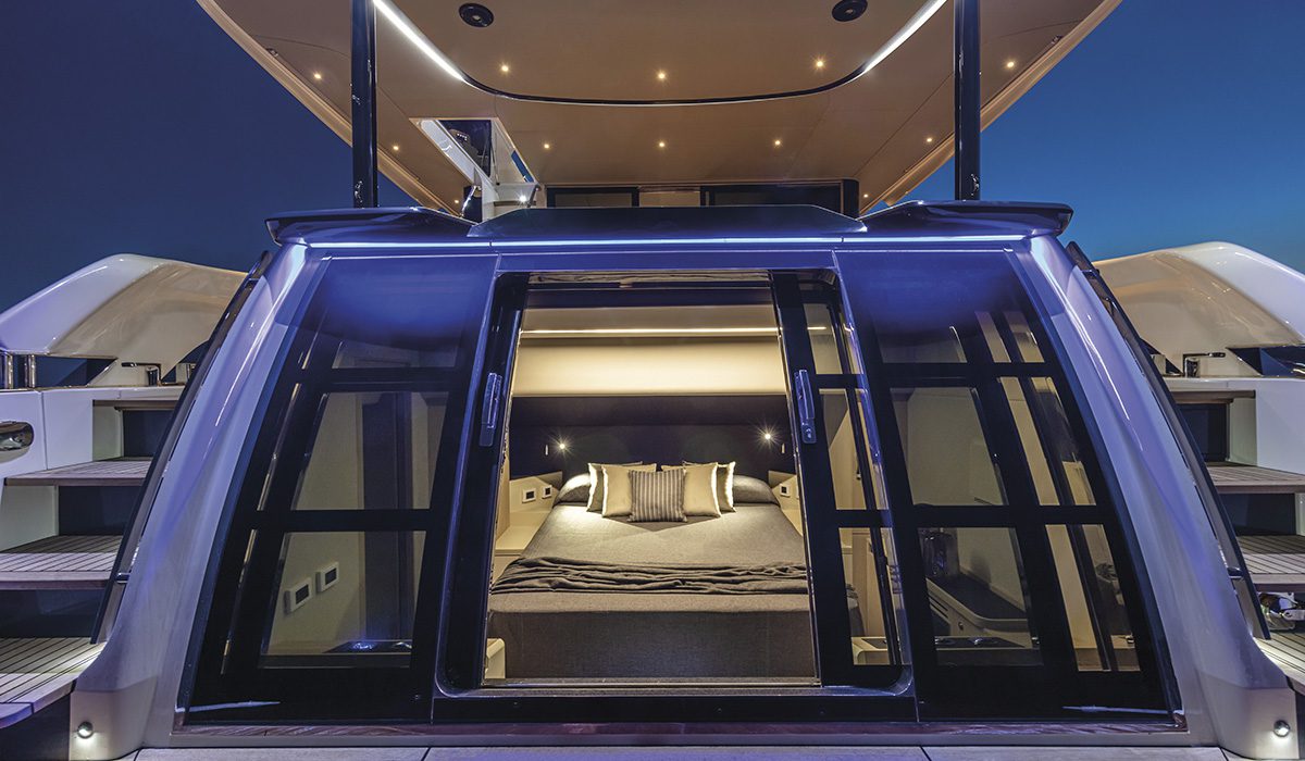 Tutto all’insegna di quel comfort e di quell’abitabilità che hanno segnato il successo internazionale del cantiere. Ma letteralmente a sorprenderci è quel che notiamo salendo a bordo dalla piattaforma balneare: lo specchio di poppa di questa versione Beach Club apre un’insospettabile cabina matrimoniale a una spettacolare vista a pelo d’acqua sul mare, con porta d’accesso vetrata curva, davvero scenografica e, soprattutto, certificata stagna. Insomma, una Beach Club di giorno e una cabina VIP di notte, ovviamente con toilette ensuite.