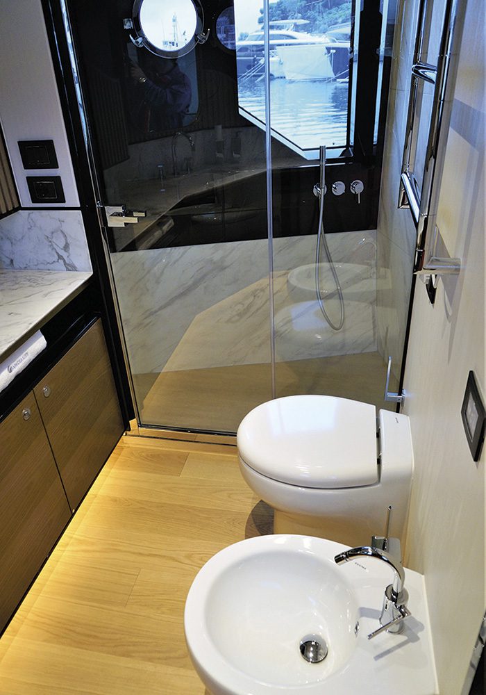 Una nota speciale sulla sala macchine che, organizzata in modo tale da favorire le operazioni di ispezione e manutenzione, ospita due Volvo Penta D13-IPS1350 da 1.000 HP: i più potenti della gamma caratterizzata dai piedi azimutali. Ebbene, trattandosi di una navetta, non ci si aspetterebbe l’agilità e la velocità che, invece, questo 64 mette in luce quando sul timone e sulle manette si agisce con una certa disinvoltura.