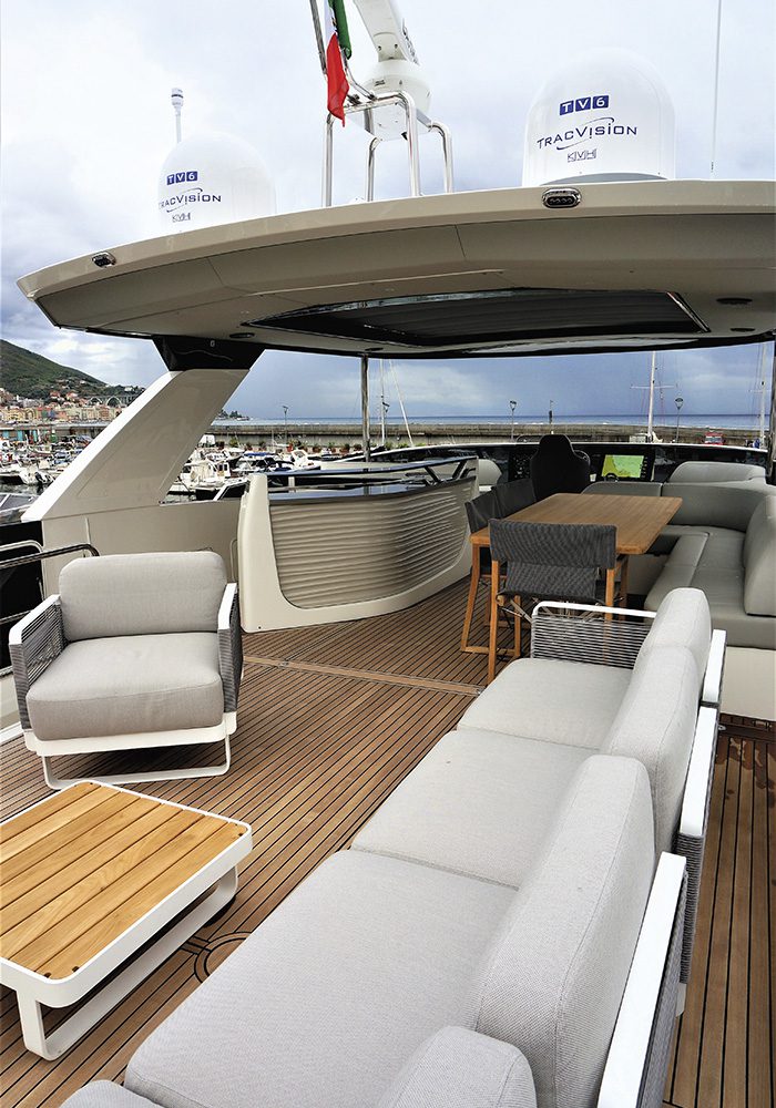 Superficie da record – in rapporto alle dimensioni dello scafo – per il fly che, completamente chiudibile mediante elementi trasparenti, permette il pieno utilizzo del suo ricco allestimento anche fuori stagione. Manco a dirlo, la stessa sensazione di spazio la si ritrova negli interni, a partire dal living che, letteralmente circondato da un’alta vetratura priva di montanti, offre una spettacolare vista sull’acqua per tutto il giro d’orizzonte.