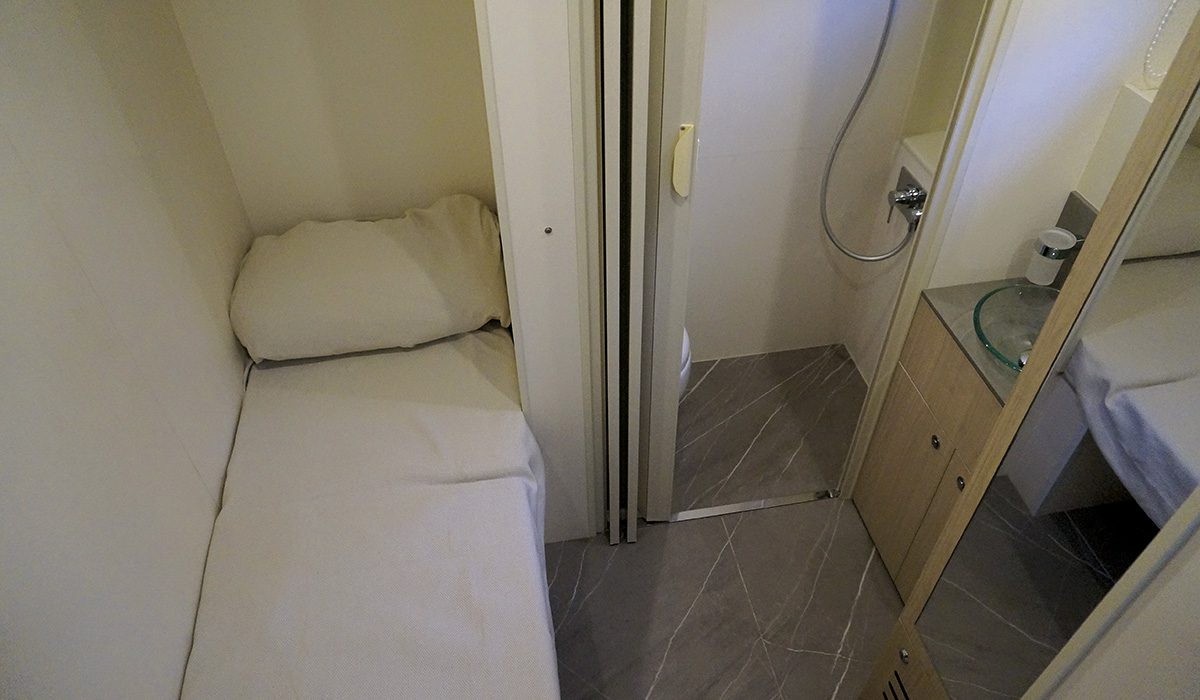 Sottocoperta la cabina armatoriale è a prua (altra caratteristica Absolute), con letto king-size, ampie vetrate laterali e bagno a tutto baglio. Quasi altrettanto ampia e accogliente è la VIP, così come più che soddisfacente è la doppia con letti appaiati: entrambe dotate di toilette ensuite, si avvantaggiano della posizione a mezzanave, laddove i fisiologici movimenti ondulatori dello scafo risultano meno accentuati.