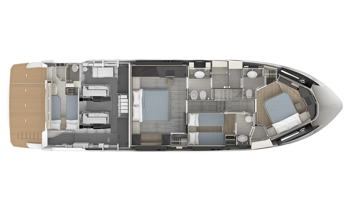 In navigazione, il 62 Fly mette in mostra la notevole portanza dell’opera viva, cosa che si traduce in un’ottima propensione alla planata e in una brillante risposta alla spinta dei due generosi Volvo Penta D11 da 725 HP dotati di piede azimutale Ips. Il perfetto accordo tra le trasmissioni e le forme di carena rende altresì lo scafo particolarmente pronto ed equilibrato alle sollecitazioni del timone.