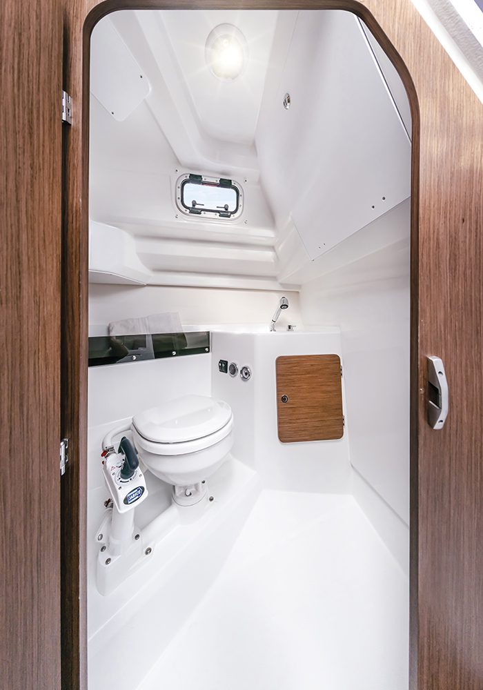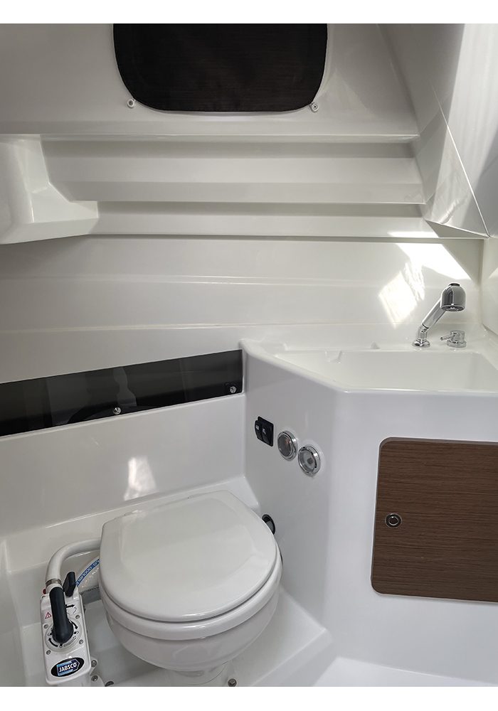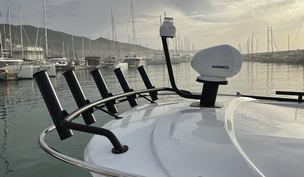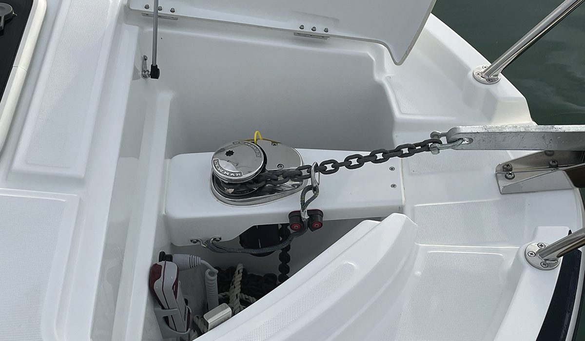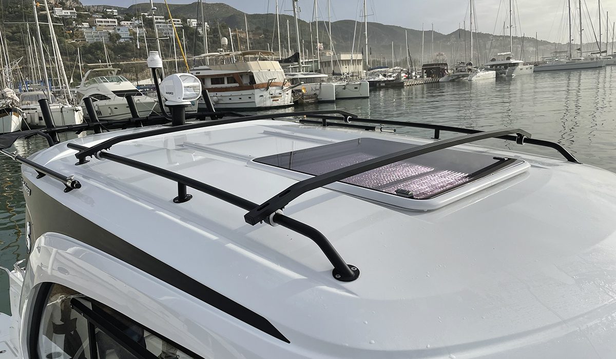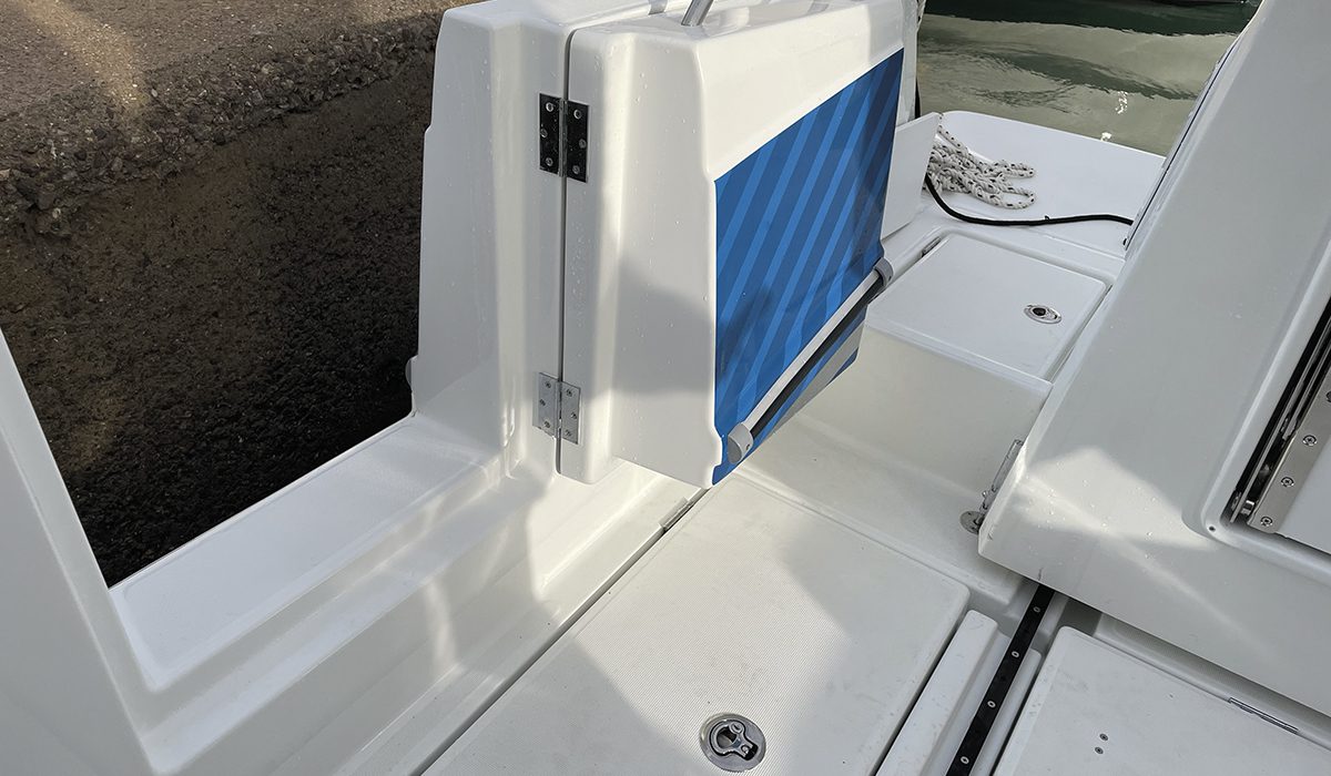 Degno di nota il vano previsto per il montaggio di un multifunzione a incasso sotto il T-Top, posizione che consente il controllo del fishfinder – accessorio quasi indispensabile per chi pesca a un certo livello – che altrimenti, se presente unicamente in plancia, risulterebbe troppo distante e sostanzialmente illeggibile. Peraltro, questo vano esterno si trova in punto dove facilmente c’è ombra, a tutto vantaggio di una visione più chiara. Molto agevoli i passavanti laterali, resi sicuri dal lungo pulpito perimetrale e dai tientibene posti sulla copertura.