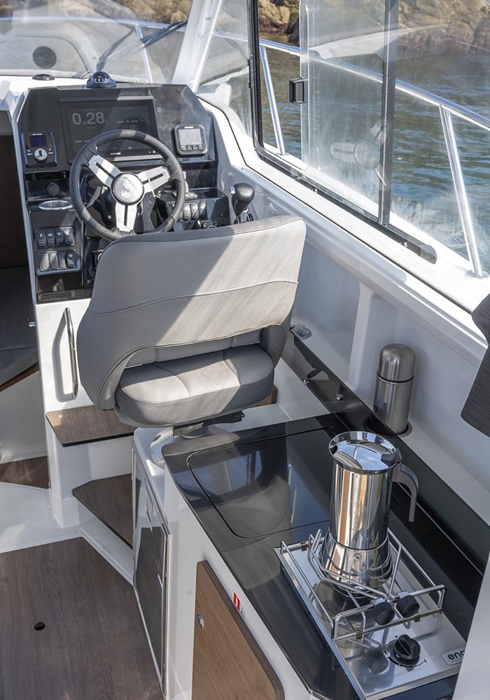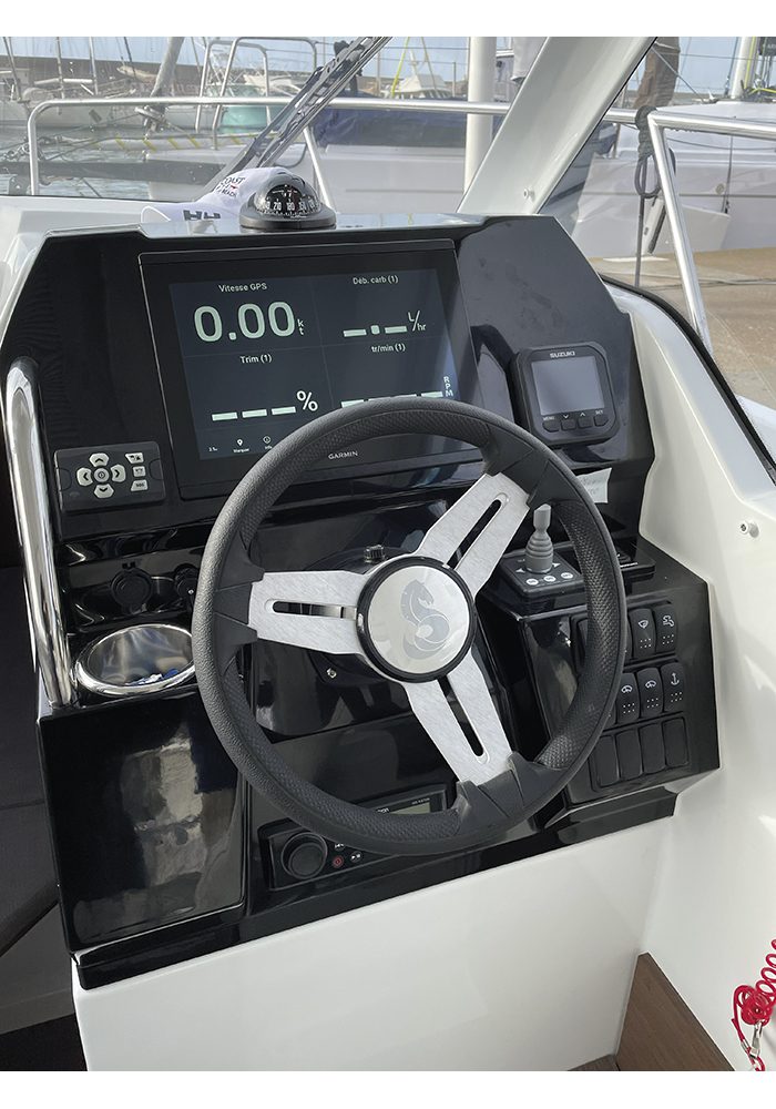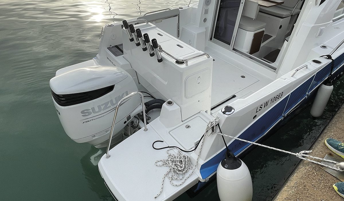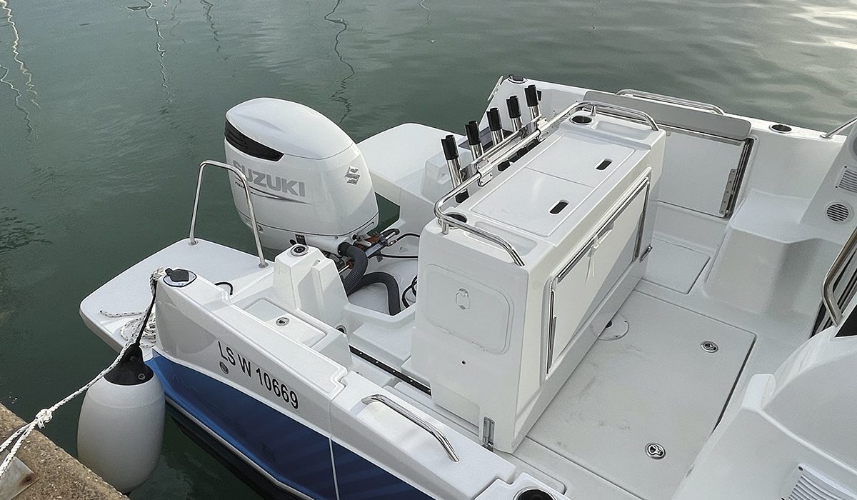 In mare è la carena a brillare: morbida sulle onde e, soprattutto, davvero molto stabile a velocità ridotta o fermi, si rivela perfettamente adatta alle tipiche andature da pesca. Grazie alla sostanziale leggerezza dello scafo e alla prontezza della motorizzazione fuoribordo, il pilotaggio risulta peraltro divertente e sicuro, facilitato anche dall’ottima visuale di cui si gode dalla postazione di pilotaggio.