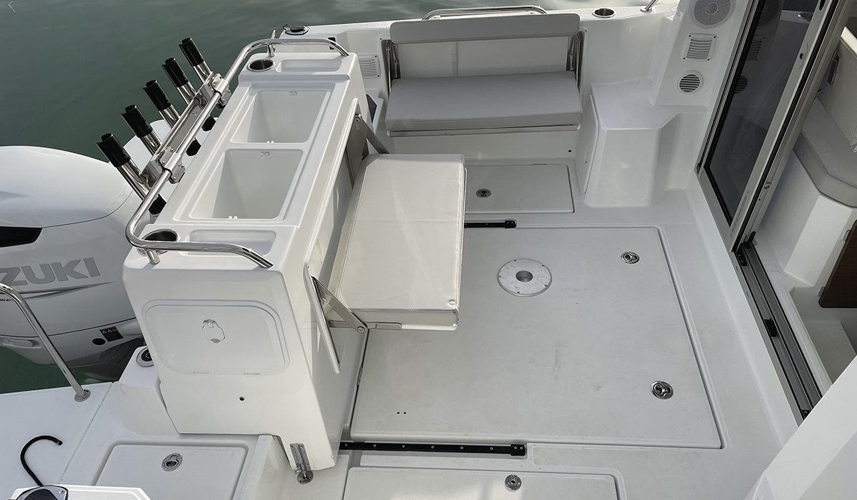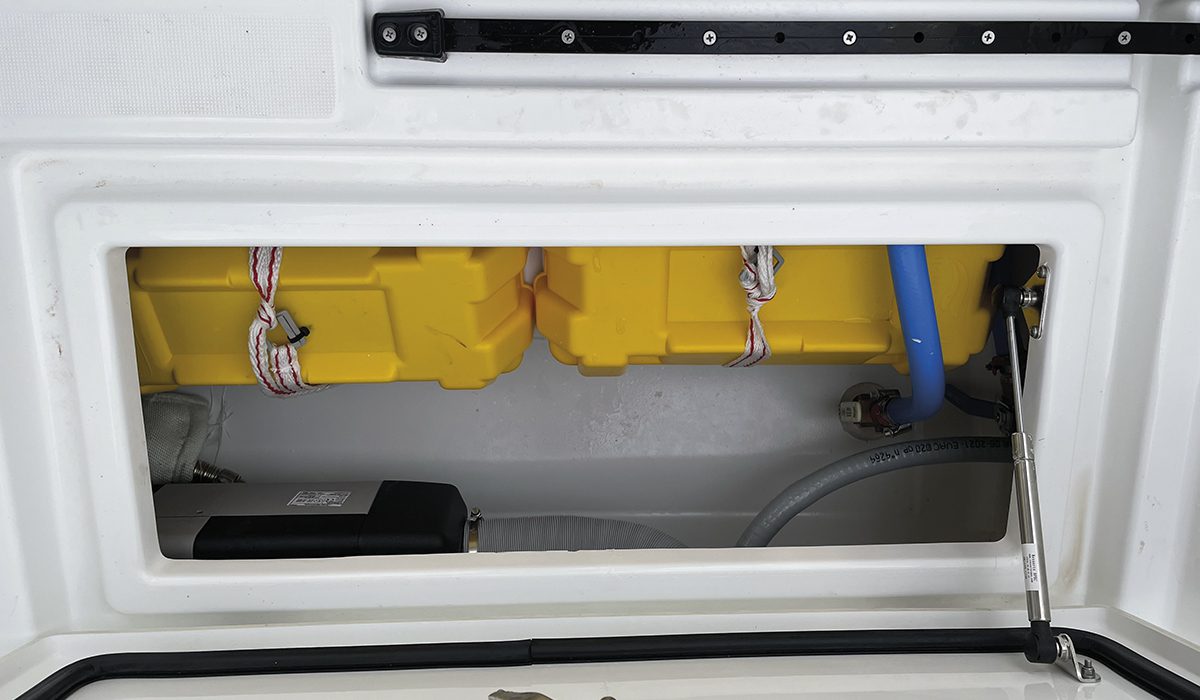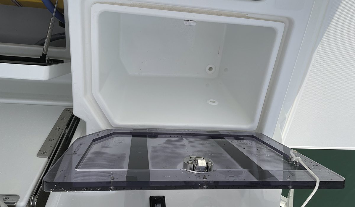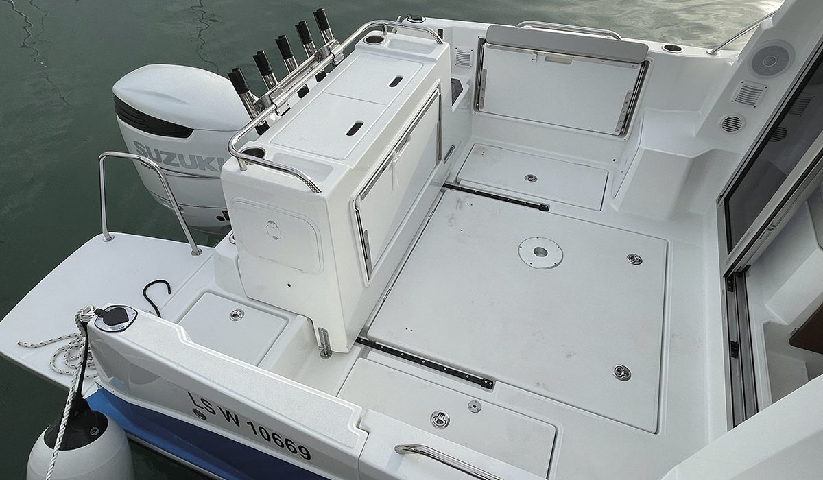 Il monoblocco-pesca, che può scorrere in avanti per consentire il completo ribaltamento del fuoribordo, è il cuore di un ambiente che comprende una panca richiudibile a scomparsa, dodici portacanne, due vasche per il pescato e una vasca del vivo con chiusura in plexiglass trasparente della capacità di circa 60 litri. Quest’ultima, dotata di pompa di ricircolo, è senz’altro di capienza sufficiente e la sua posizione non comodissima, in basso, è stata comunque decisa per salvaguardare l’esca viva in caso di trasferimenti con mare agitato. Sempre in pozzetto troviamo tre gavoni, di cui uno con vasca estraibile, molto utile per le sarde da usare come pastura o per il pescato.