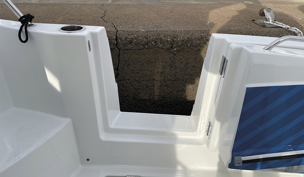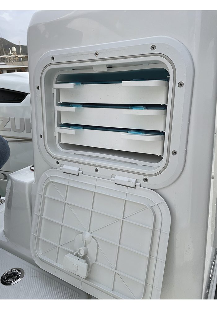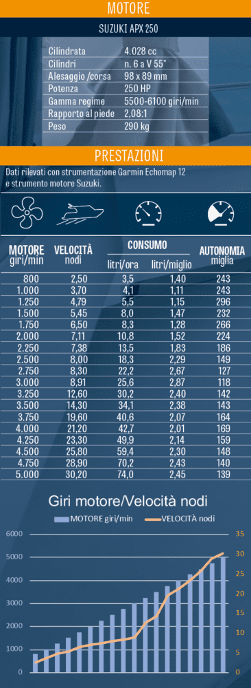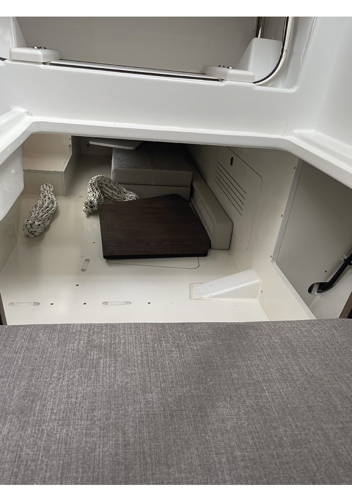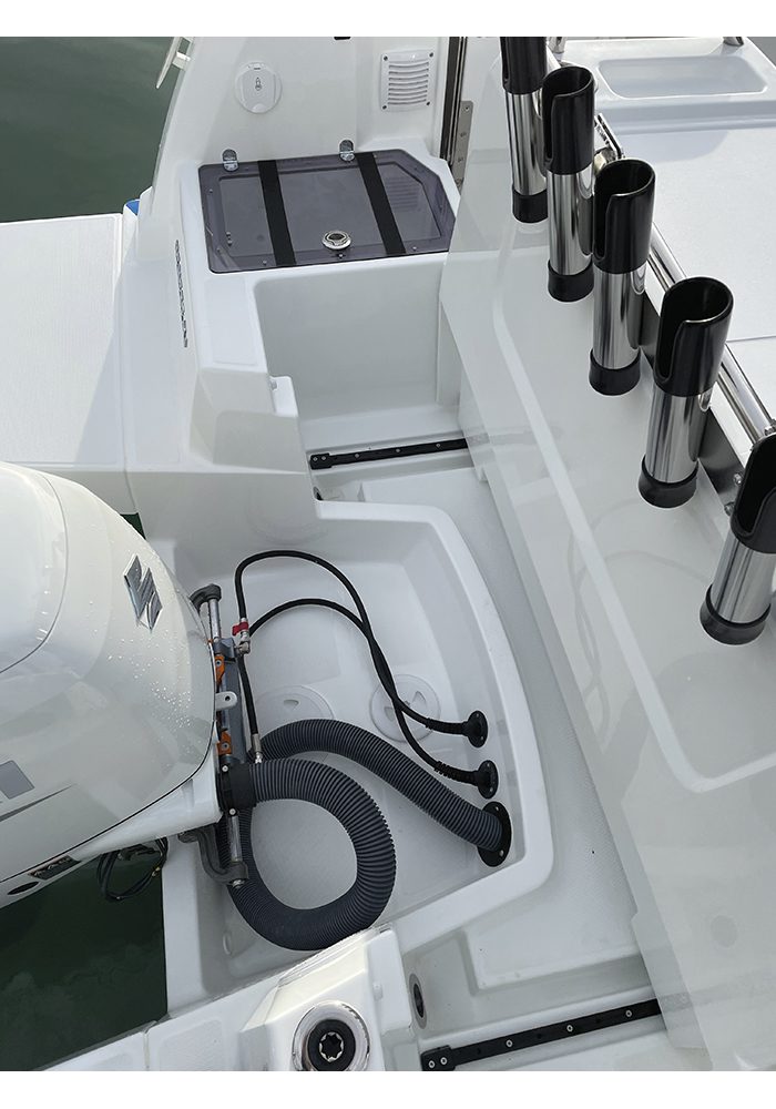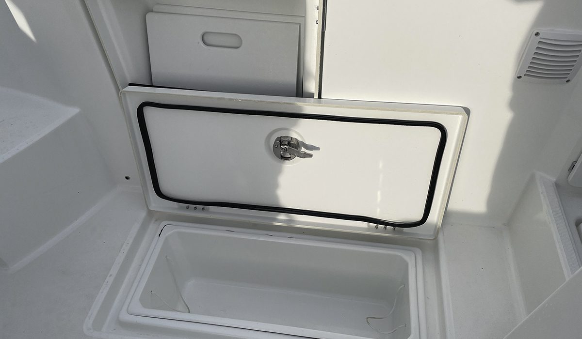 Il monoblocco-pesca, che può scorrere in avanti per consentire il completo ribaltamento del fuoribordo, è il cuore di un ambiente che comprende una panca richiudibile a scomparsa, dodici portacanne, due vasche per il pescato e una vasca del vivo con chiusura in plexiglass trasparente della capacità di circa 60 litri. Quest’ultima, dotata di pompa di ricircolo, è senz’altro di capienza sufficiente e la sua posizione non comodissima, in basso, è stata comunque decisa per salvaguardare l’esca viva in caso di trasferimenti con mare agitato. Sempre in pozzetto troviamo tre gavoni, di cui uno con vasca estraibile, molto utile per le sarde da usare come pastura o per il pescato.