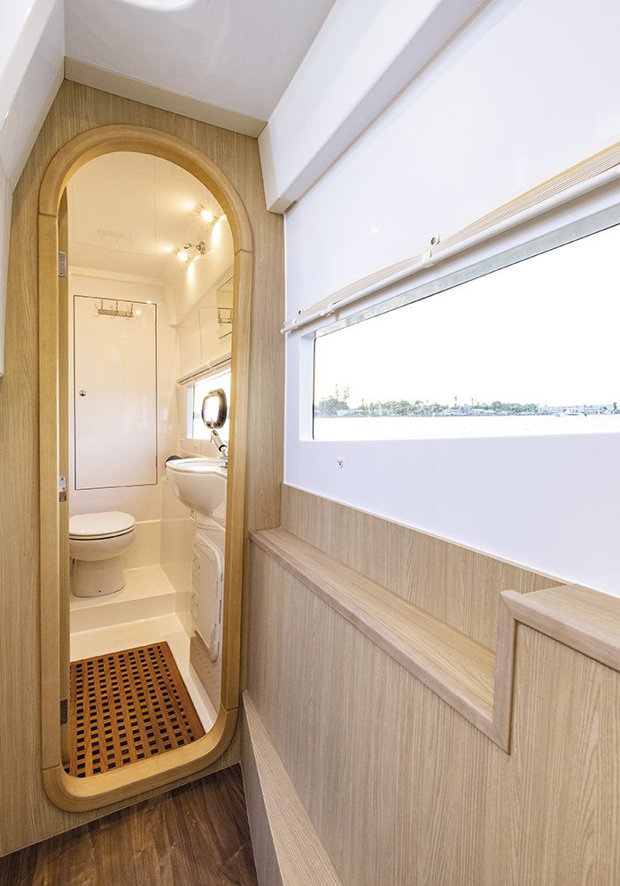 Così organizzato, questo catamarano si afferma nettamente come un day cruiser che, nell’utilizzo armatoriale, offre livelli di abitabilità e comfort veramente alti. Inoltre, la presenza di due belle cabine matrimoniali con bagno, una per scafo, permette di ampliare il range temporale di utilizzo e andare oltre l’uscita giornaliera.