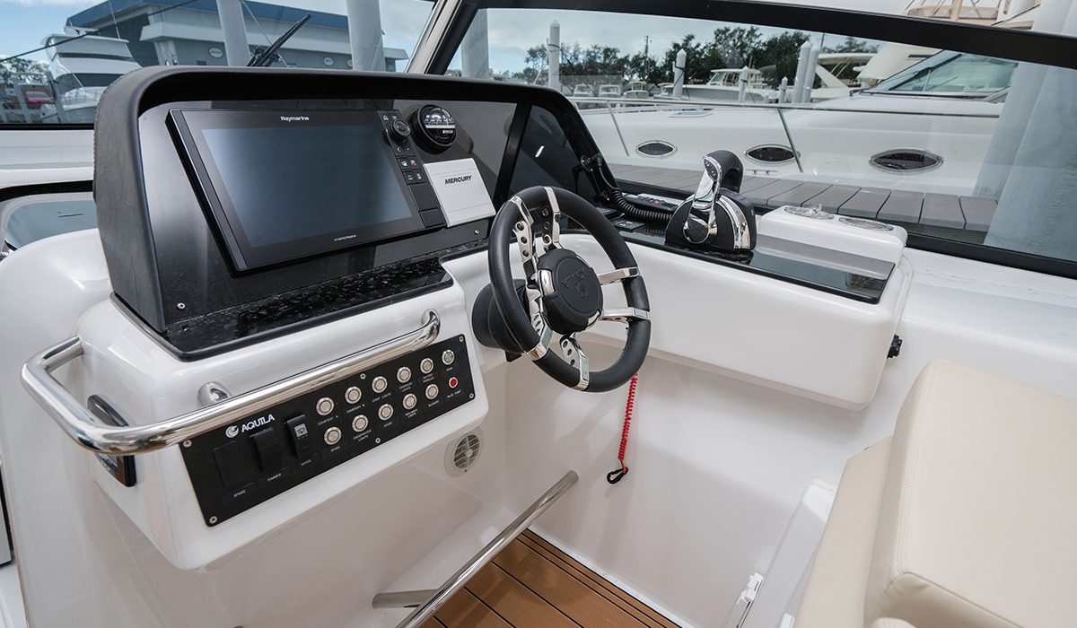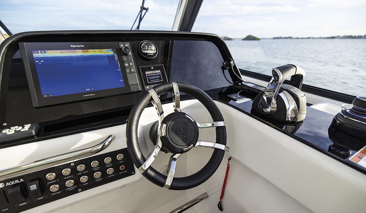 Semplice ed efficace la conduzione in acque ristrette: seppure molto vicini fra loro, i due motori sono di per sé una bella garanzia di manovrabilità; associati poi al Joystick Mercury, rendono Aquila 36 un docile passerotto da condurre ovunque.