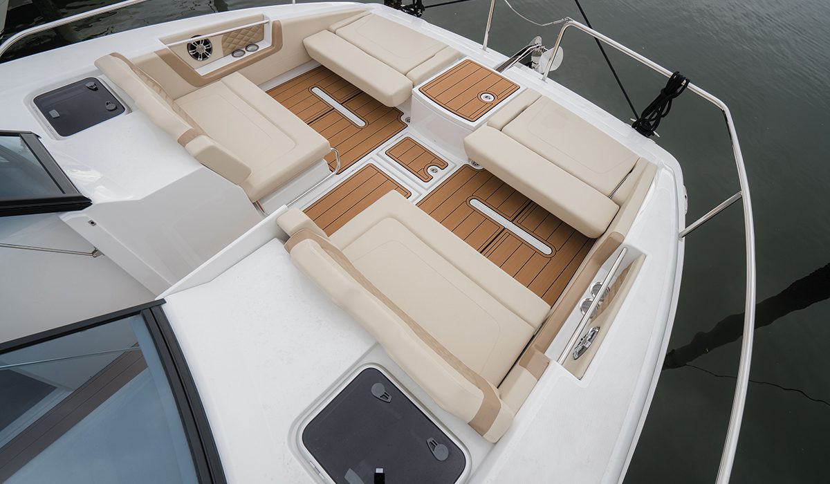 La profonda plancia di poppa, che porta la lunghezza fuori tutto a 11,96 metri e senza la quale lo scafo resta sotto i 10 metri, quindi nella categoria natanti, è l’elemento che dall’esterno contribuisce a suggerire l’idea di grande spazio disponibile all’aperto. Una volta a bordo però, ci si rende conto che si tratta solo di un tassello con cui i progettisti hanno organizzato gli spazi in coperta e sotto l’hard top.