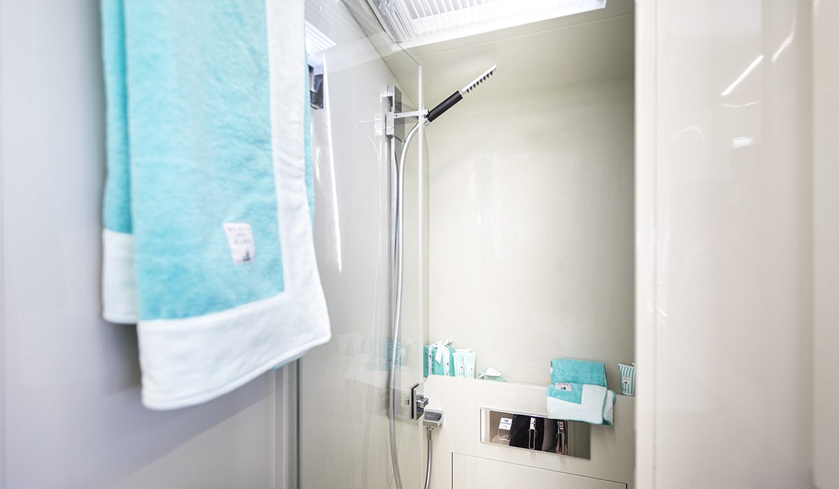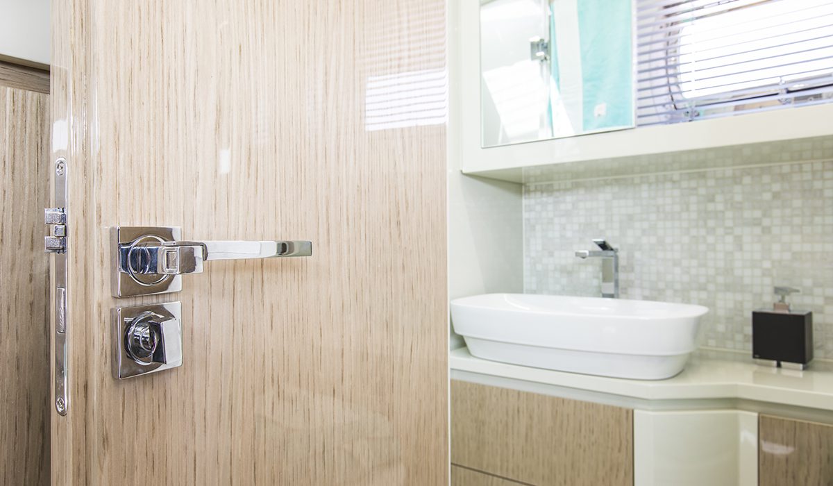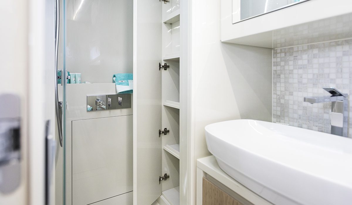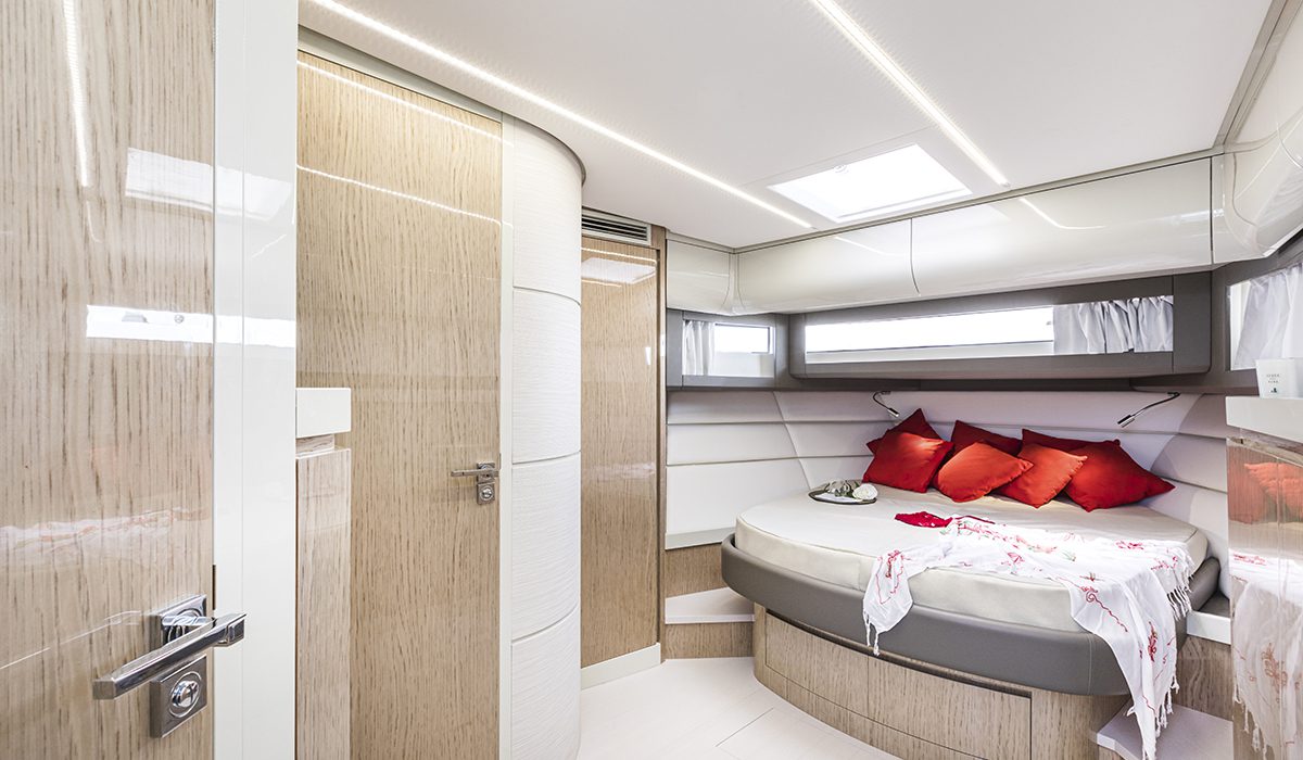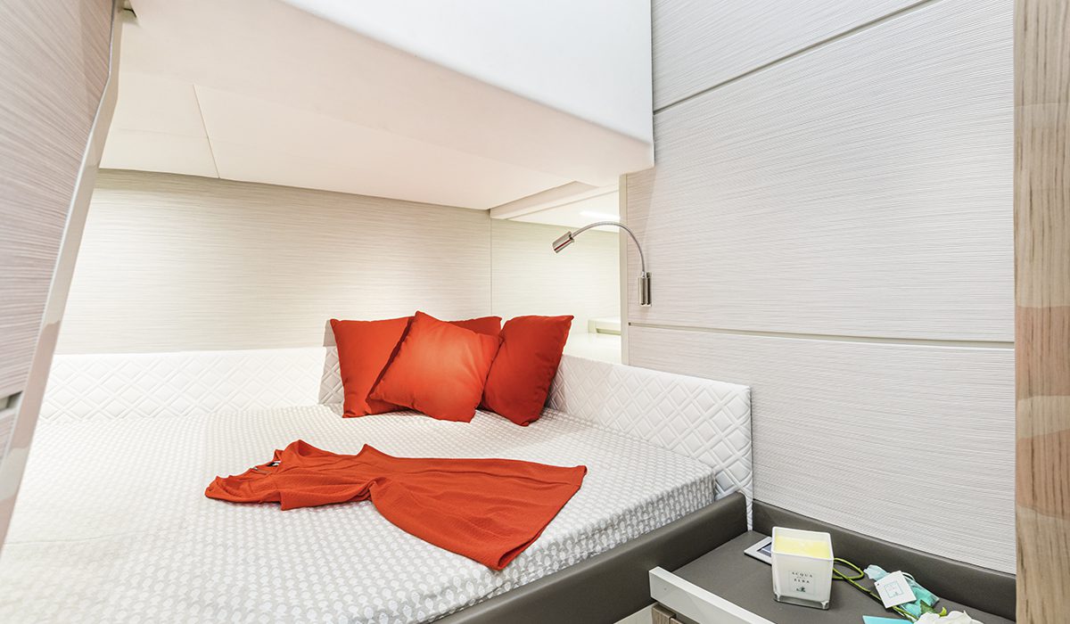 Disponibile in tre versioni, l’Ibiza 44 WA dispone in ogni caso di una zona notte per quattro persone, in due ambienti separati, con una toilette unica ma molto spaziosa, dotata di vano doccia separato. La finestratura perimetrale garantisce buona luminosità, ma ad incrementare la sensazione di spaziosità contribuisce la notevole altezza in cabina, comune a tutti gli ambienti.