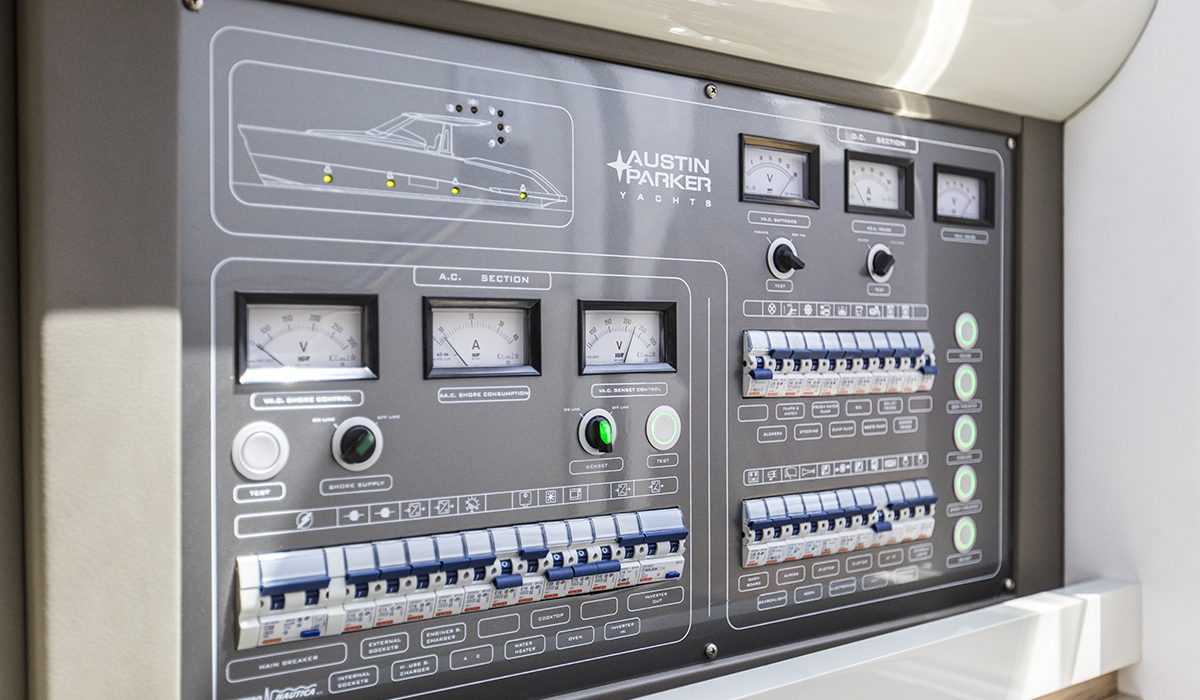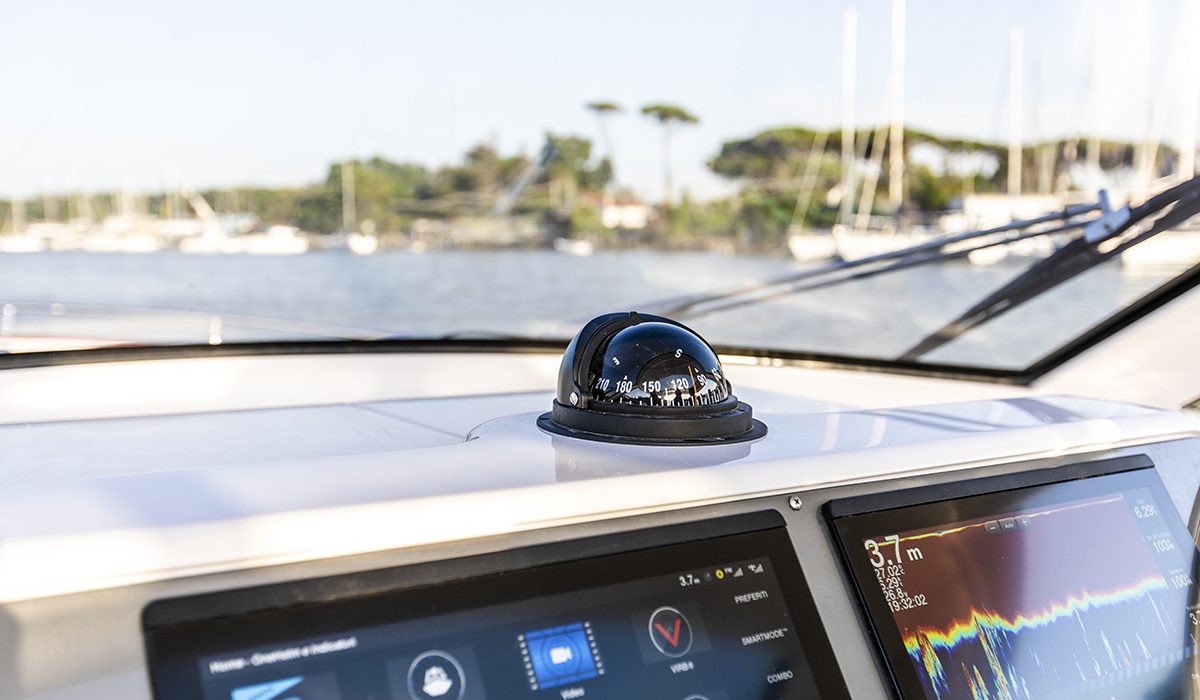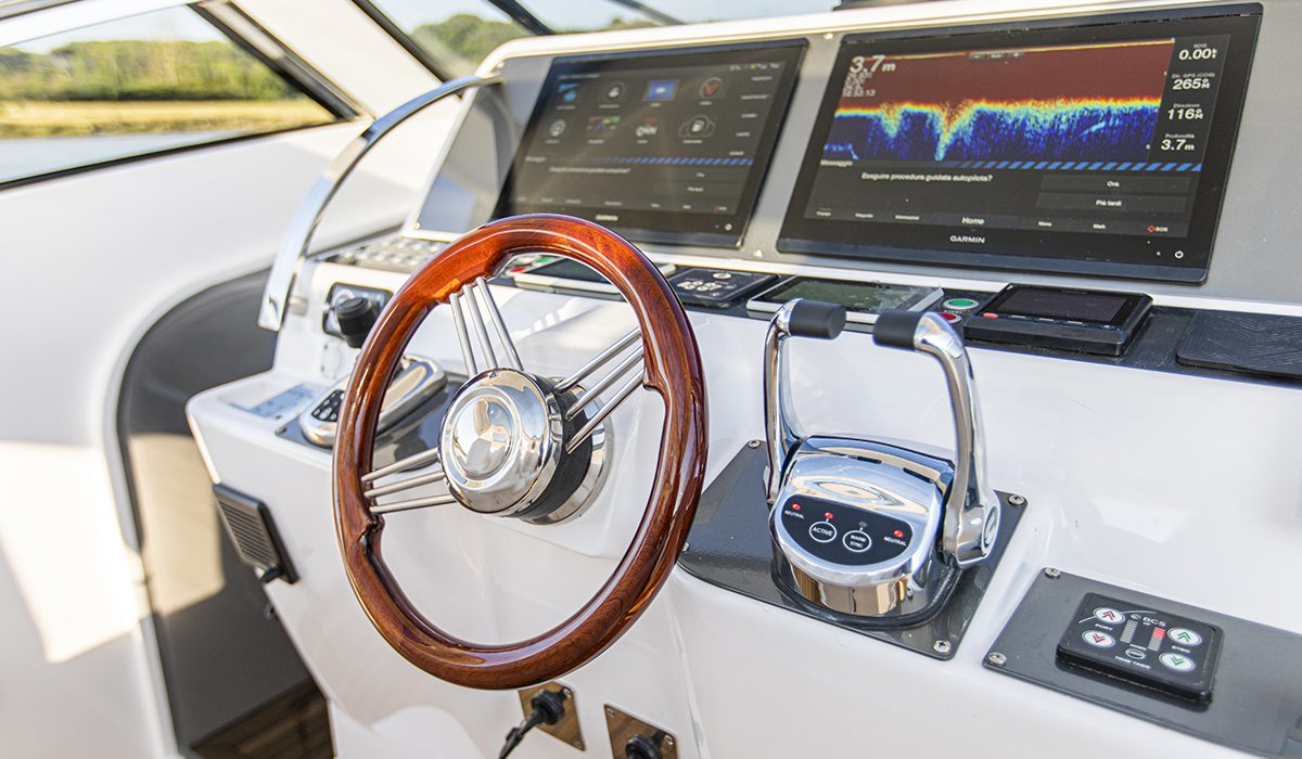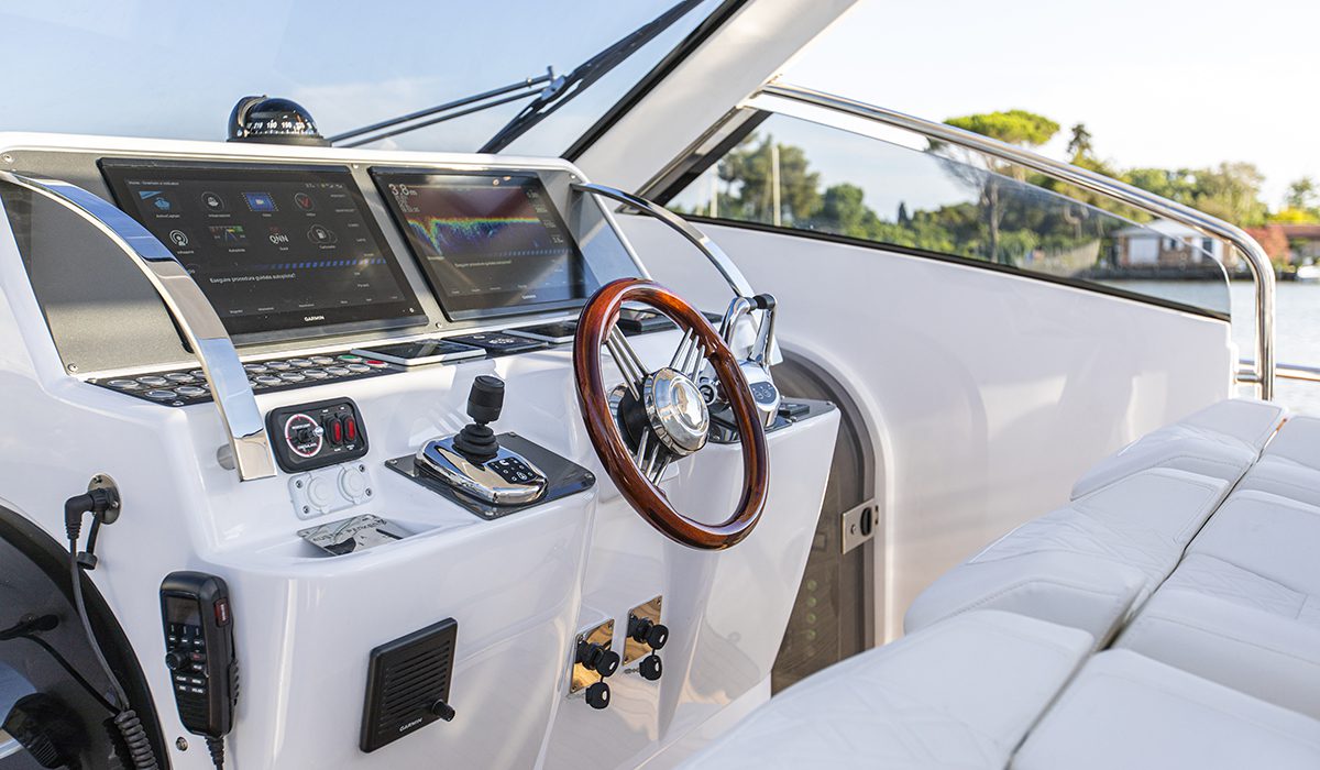 Ergonomia della plancia: ottima. Tre poltroncine di impostazione sportiva; ricca strumentazione sulla quale dominano i due monitor Garmin da 16”; joystick di manovra interfacciato con eliche di prua e di poppa.