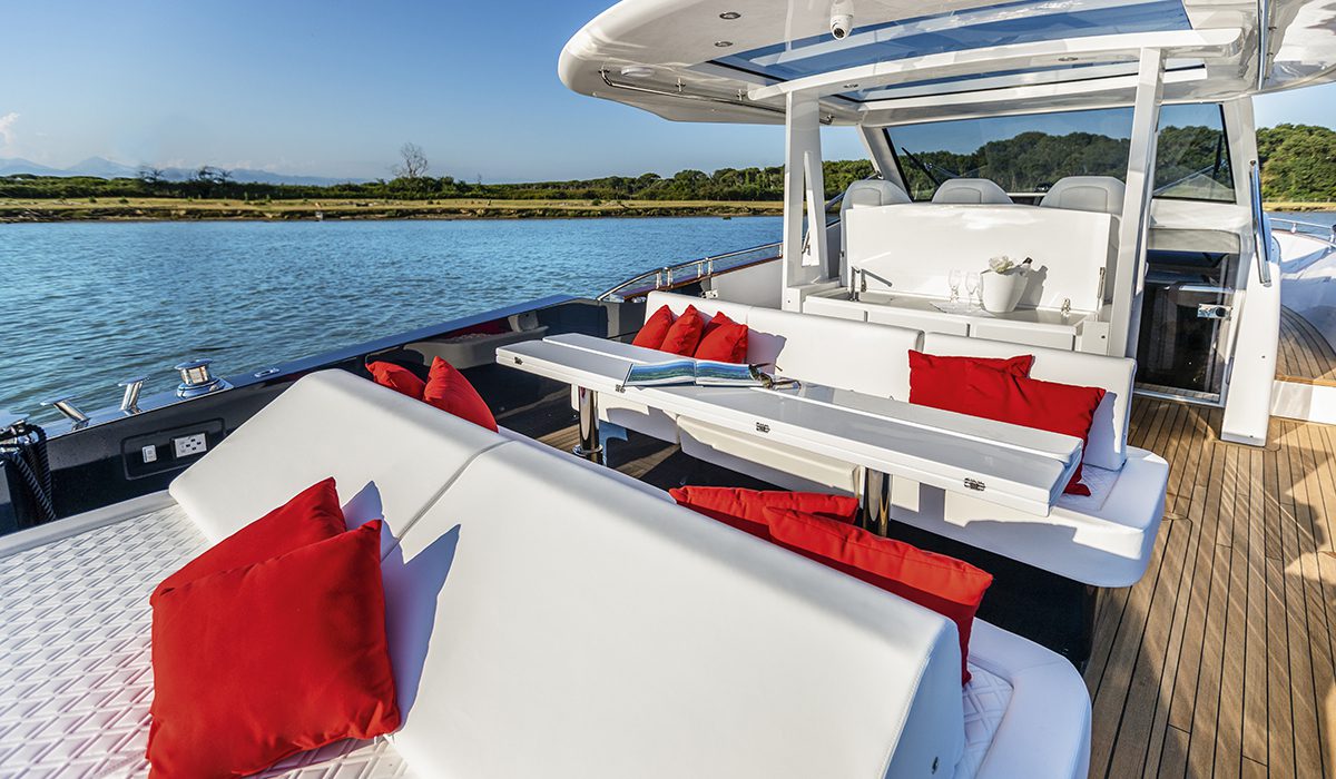 Allestimento del pozzetto: data l’impostazione progettuale non esiste un vero e proprio pozzetto, ma un unico piano di calpestio su cui si inseriscono gli arredi. Nella barca da noi provata i due grandi prendisole king size lasciano un comodo accesso al mare e non ostacolano la vivibilità della dinette. Da notare il portellone a sollevamento idraulico che nasconde il vano del tender e l’hard top apribile. Elegante il rivestimento in teak dei piani di calpestio (standard).