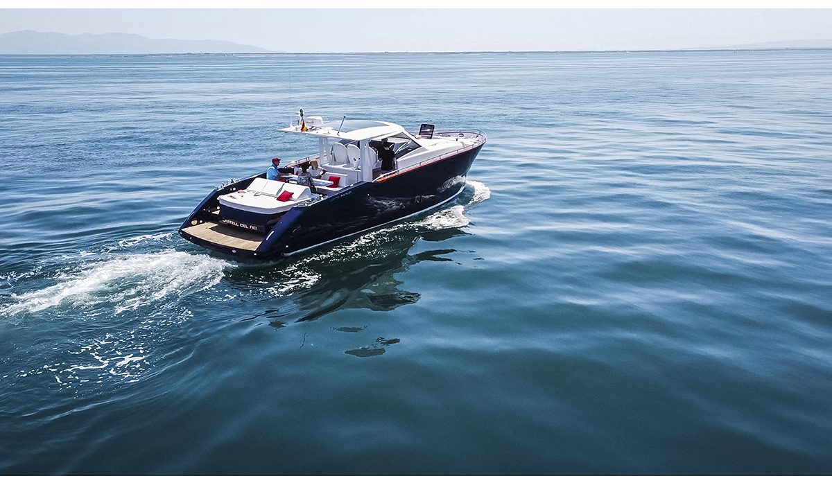 Non si tratta infatti solo di selezionare arredi e soluzioni del pozzetto, ma anche di poter scegliere fra diverse tipologie di motorizzazione che possono influire sia sulle linee d’acqua sia sull’impostazione del pozzetto. Nella versione entrobordo in linea d’asse, quella da noi provata, la carena dell’Ibiza 44’ si dimostra come la chiara evoluzione delle classiche linee d’acqua di un lobster, quindi con un tagliamare ben profilato, un deadrise moderato e un ginocchio leggermente rovescio che assicura grande stabilità. Caratteristiche che si apprezzano pienamente in navigazione a velocità di crociera anche con mare formato e ancor più affondando le manette.