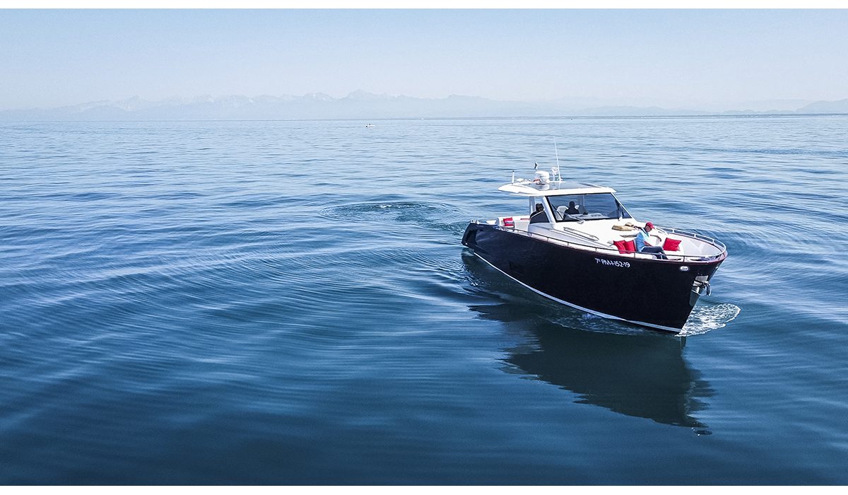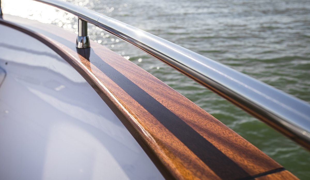 Tutto questo esalta la filosofia della barca che, nella sua formula, nasce tipicamente mediterranea, tutto sole e mare, con qualche civettuolo tocco di eleganza assolutamente apprezzabile. Anzi su questo vanno spese due parole in più per portare l’attenzione sui dettagli. Se il capodibanda, la ruota timone e gli inserti dei tientibene in mogano risaltano al primo impatto per il loro raffinato stile vintage, è importante sottolineare la qualità della componentistica che si apprezzerà nell’uso e nel tempo. Senza dimenticare il tendalino facilmente installabile inserendo due montanti in fibra di carbonio.