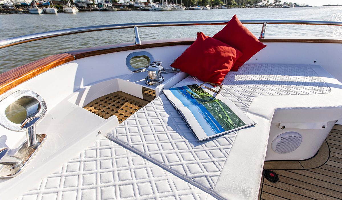 Finiture: uno dei punti di forza della barca, sia negli interni sia negli esterni, dove spicca il rivestimento della tappezzeria.